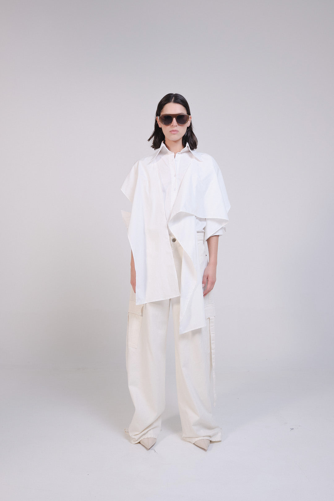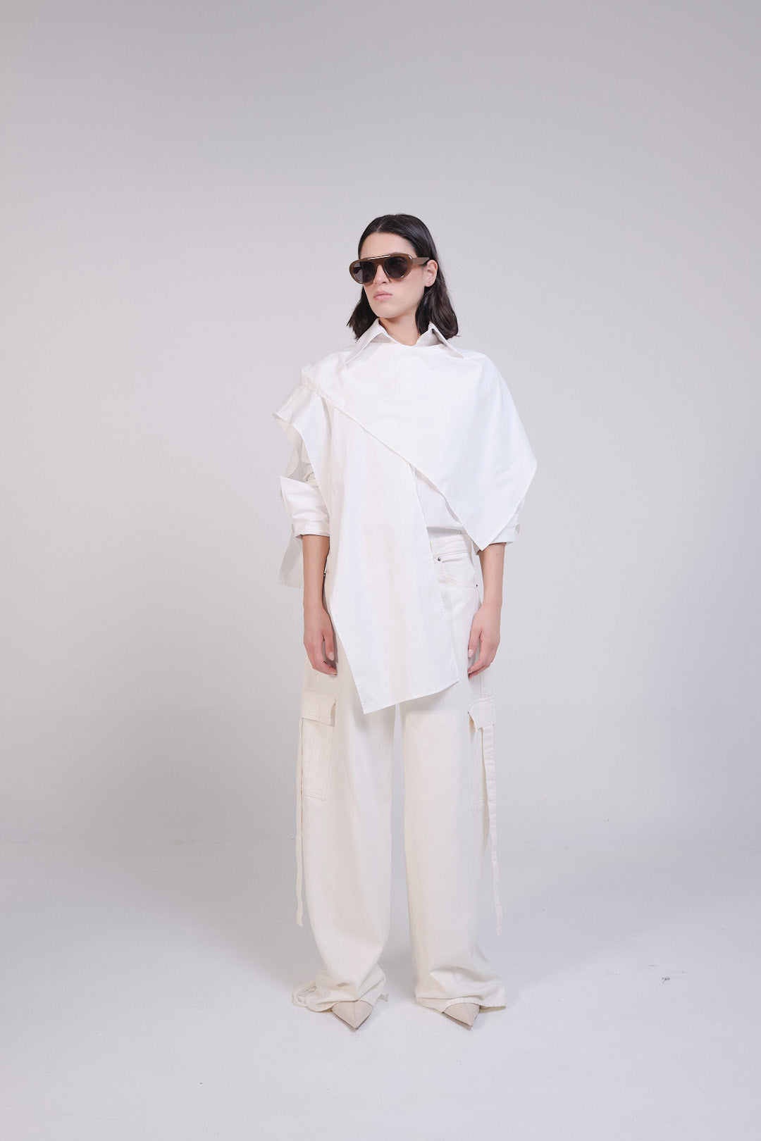 Camisa de popelina blanca, manga larga con abotonadura frontal y capa adicional removible.