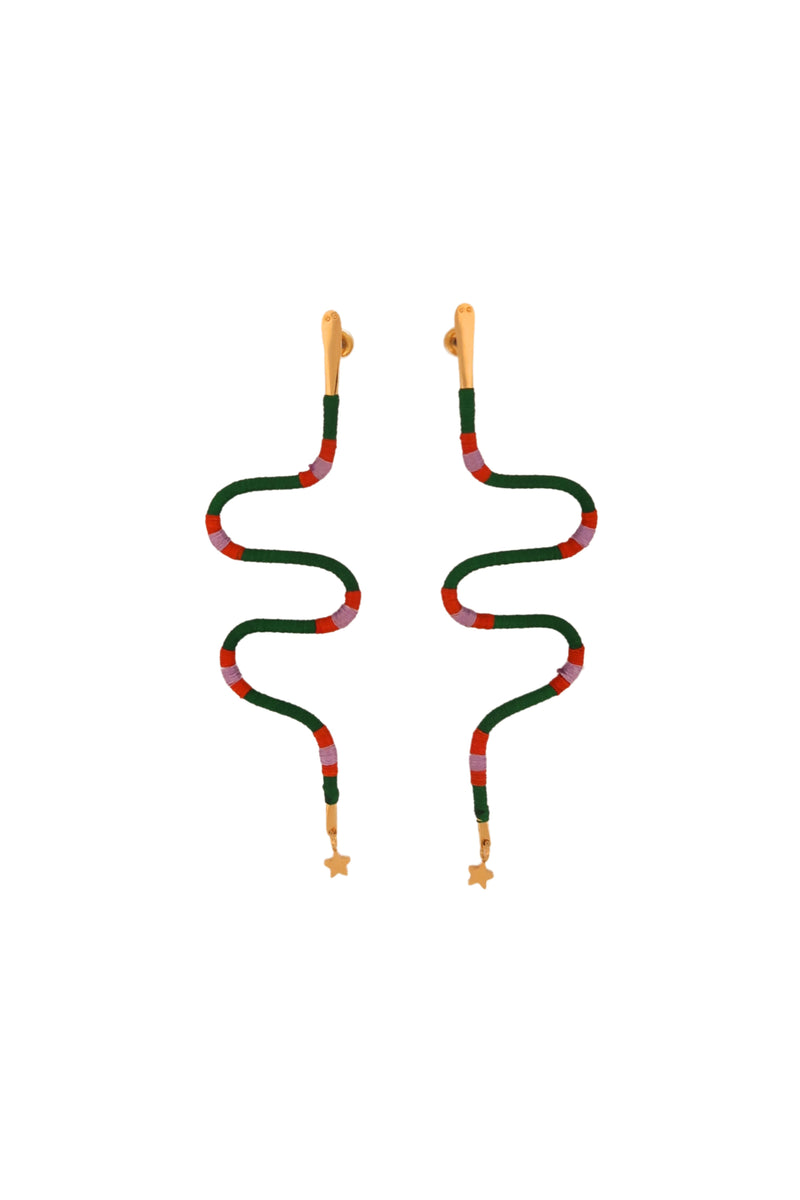 Divertidos y audaces, estos pendientes de bronce bañados en oro adoptan la forma de sinuosas serpientes. Decorados con hilos tejidos a mano en vibrantes tonos, su diseño único añade un toque vibrante y texturizado a tu look. El delicado detalle de estrella en el extremo realza su encanto caprichoso.