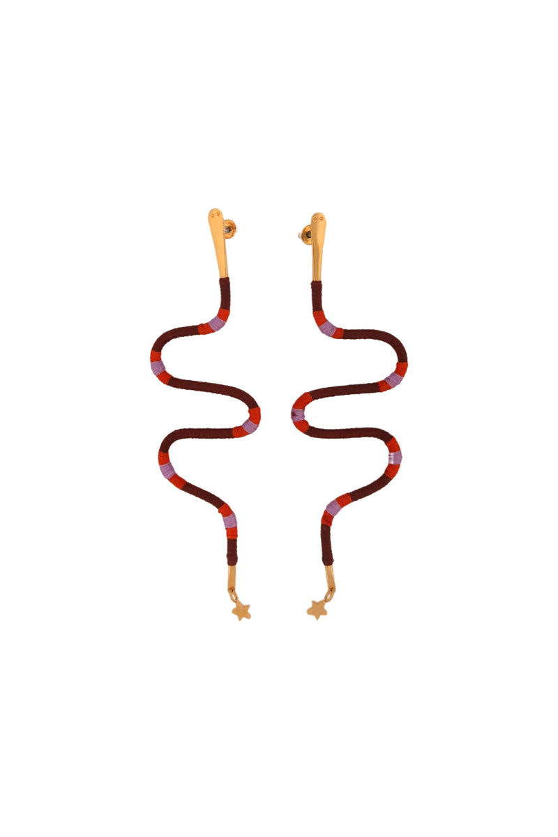 Divertidos y audaces, estos pendientes de bronce bañados en oro adoptan la forma de sinuosas serpientes. Decorados con hilos tejidos a mano en vibrantes tonos, su diseño único añade un toque vibrante y texturizado a tu look. El delicado detalle de estrella en el extremo realza su encanto caprichoso.