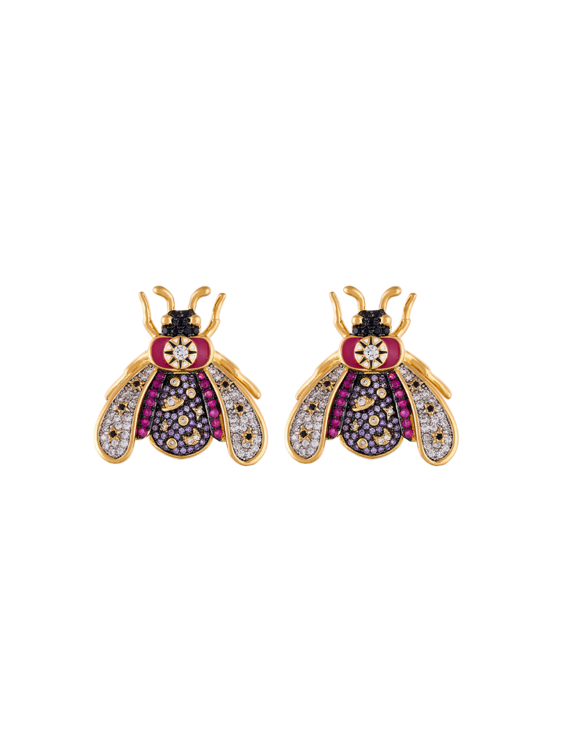 Los Topos Vespa Happi Burgundy evocan la profundidad del cosmos y la vida del río Nilo, una joya que combina elegancia y belleza eterna. Elaborados en metal bronce con un baño de oro de 18 kilates, rodio blanco y rodio negro, enriquecido con deslumbrantes circones en tono rubí, amatista, negro, y cristal. Las técnicas de esmalte en tono burgundy, blanco y negro realzan su diseño único, creando un juego de contrastes que cautivará.