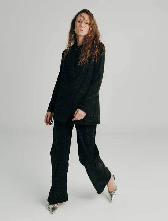 Blazer cruzado de fit oversize. Incorpora hombreras para aportar estructura a la silueta. Blazer de tela gruesa con tacto gamuzado y estampado de leopardo e interior afelpado. No lleva forro.