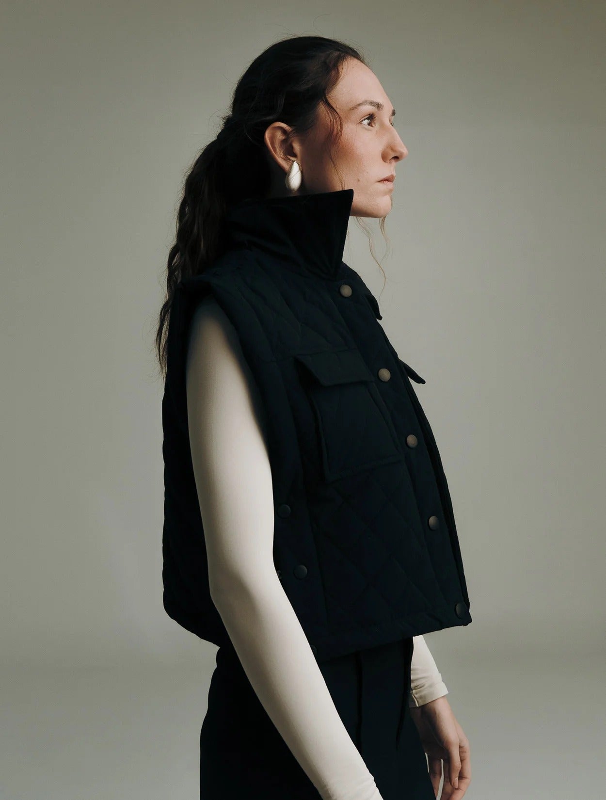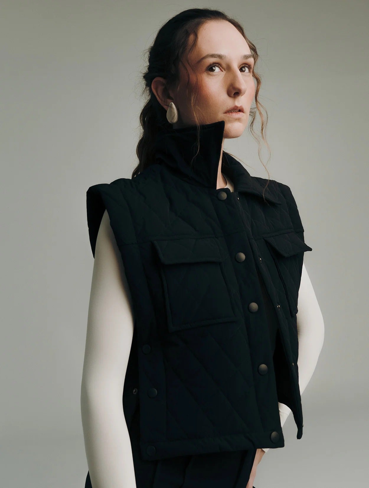 Chaleco de confección clásica acolchada, materiales ligeros. Cuenta con bolsillos funcionales con solapa, broches metálicos. Su diseño versátil lo convierte en una pieza clave, perfecto para quienes buscan estilo y comodidad en una sola prenda.