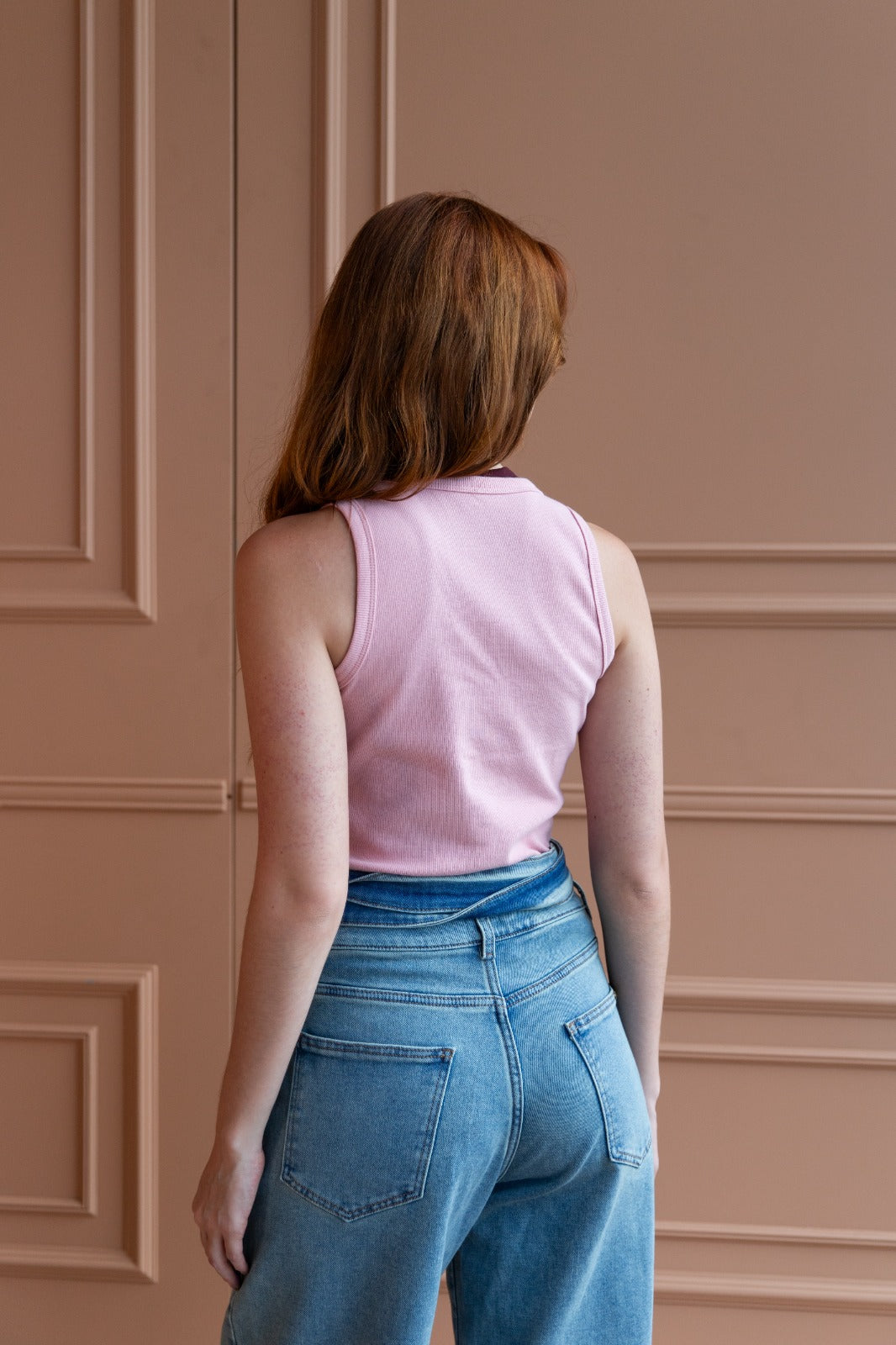 Top conformado por 2 prendas; una externa en rib suave con cortes en las copas y botones bañados en oro y una interior con una tela sport, puedes usarlas juntas o separadas