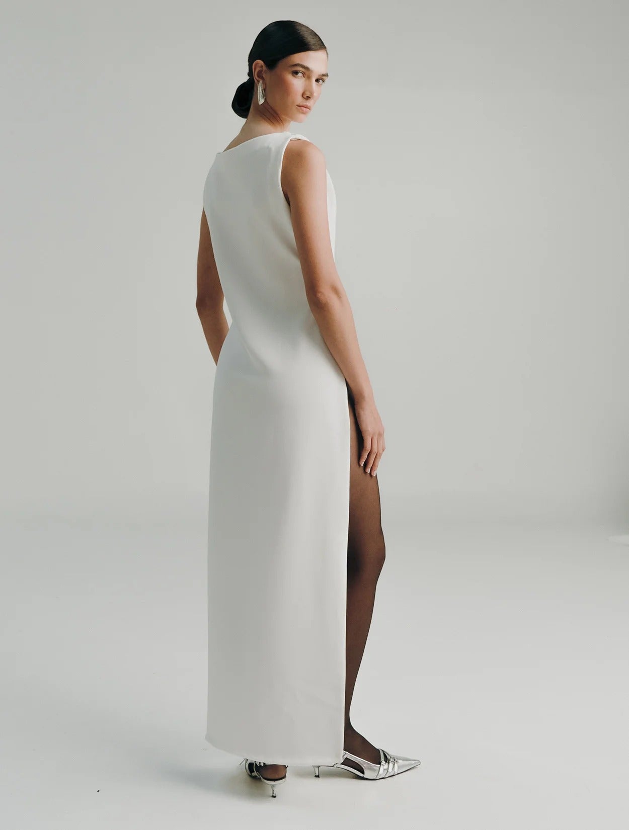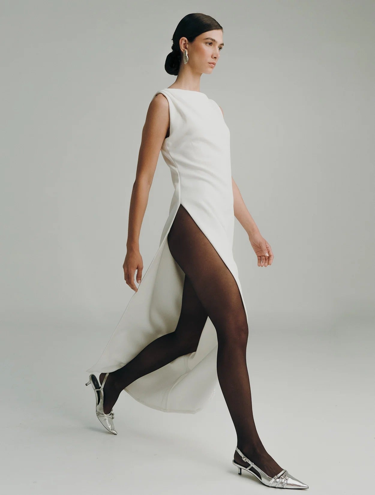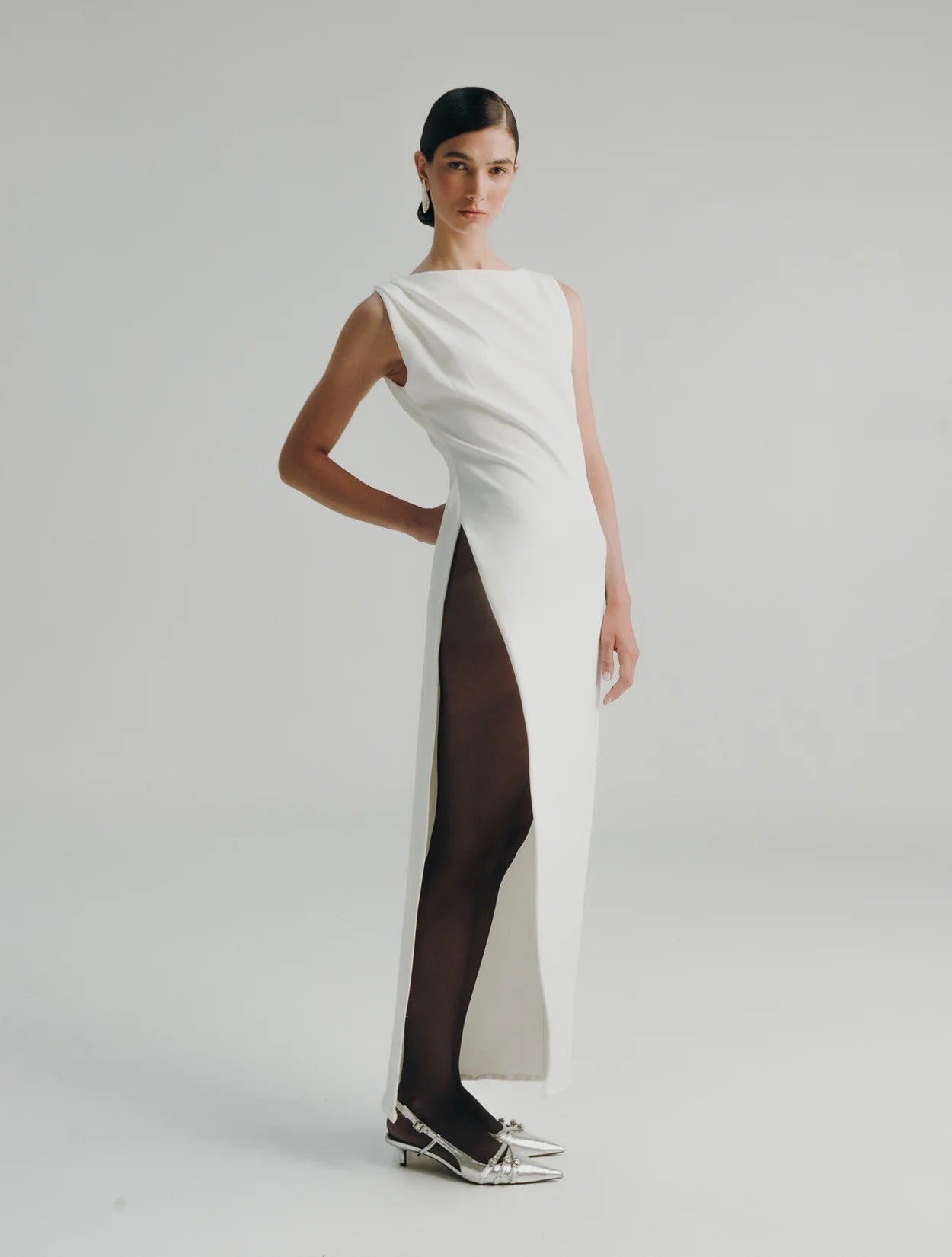 Top largo con drapeado fijo hacia un hombro, acompañado de herraje metálico dorado. Abertura diagonal en el delantero, desde la cintura hasta el ruedo.