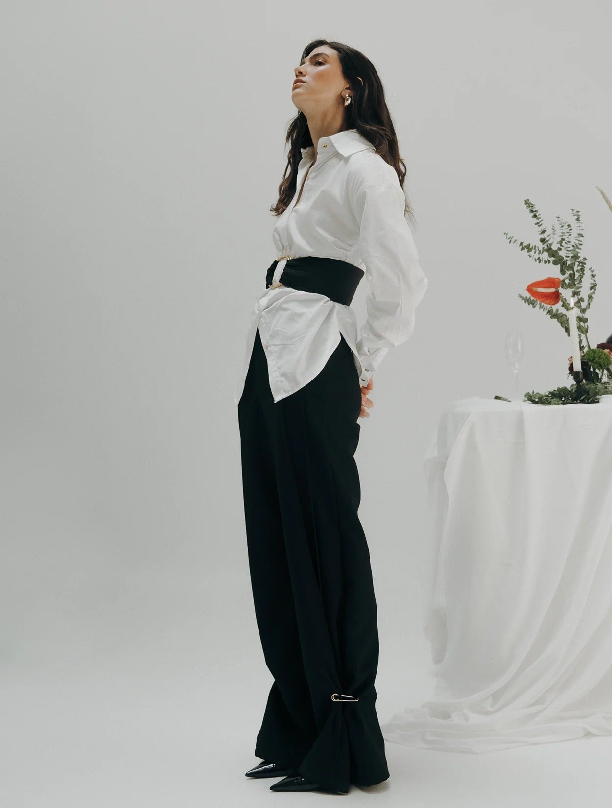 Pantalón en paño ligero de corte amplio, con pespuntes marcados en el delantero. El ruedo lleva un surcido con detalle de nodriza dorada que aporta un acento sutil.