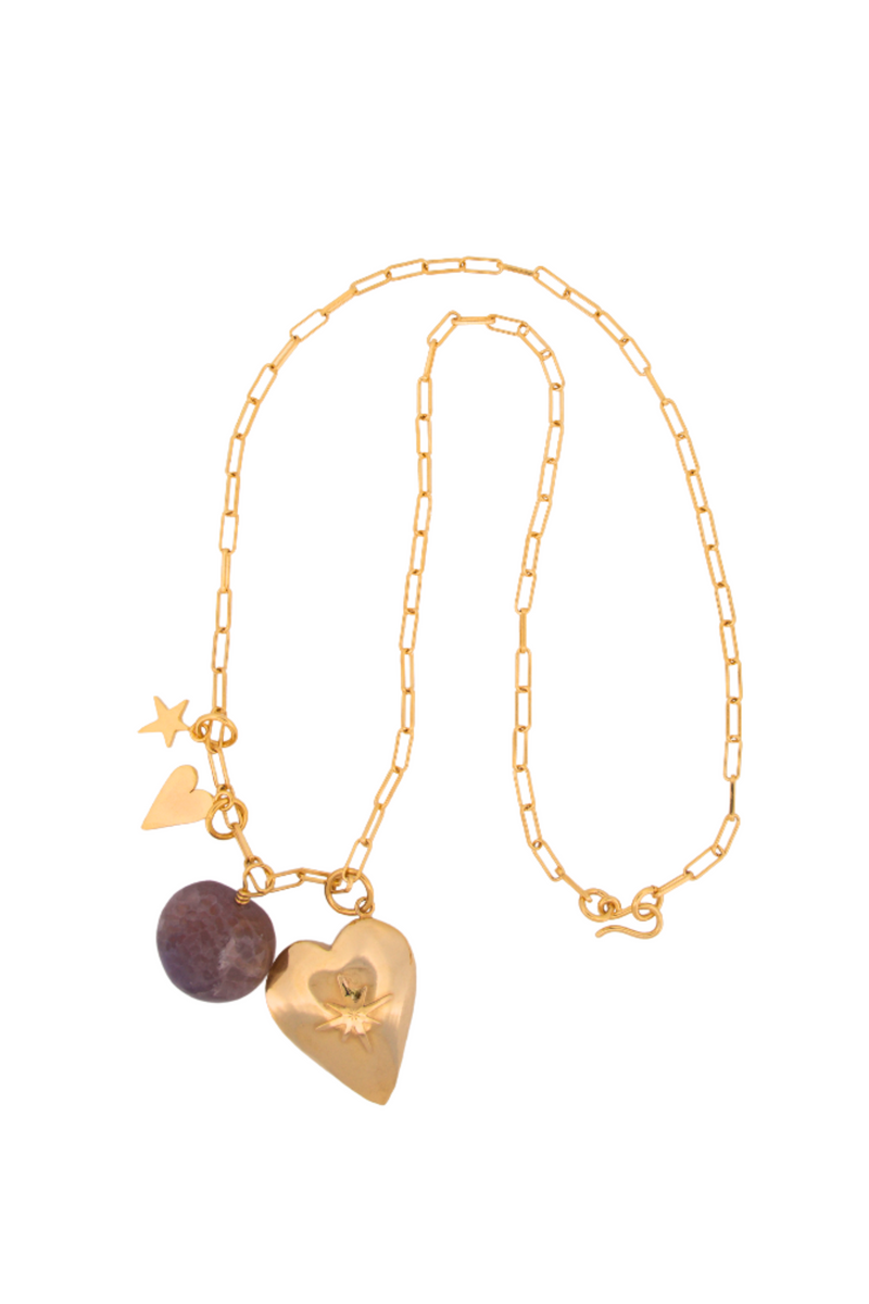 Una pieza que transmite amor y luz. Esta delicada cadena luce un dije de corazón grabado con una estrella radiante, que simboliza guía y pasión. Adornada con mini dijes de inspiración celestial y una piedra natural, es una adición de ensueño para cualquier colección.