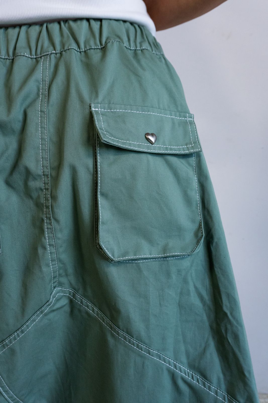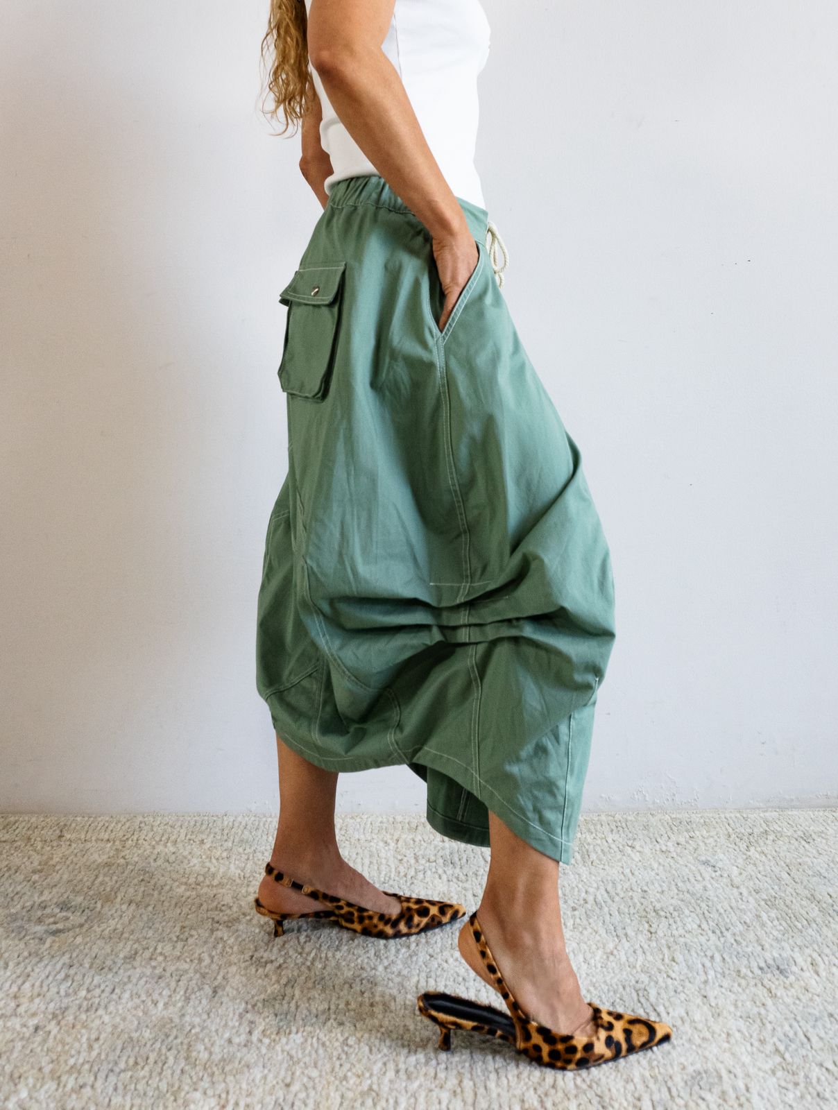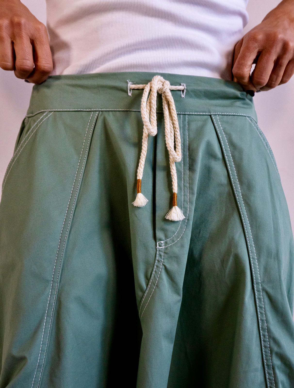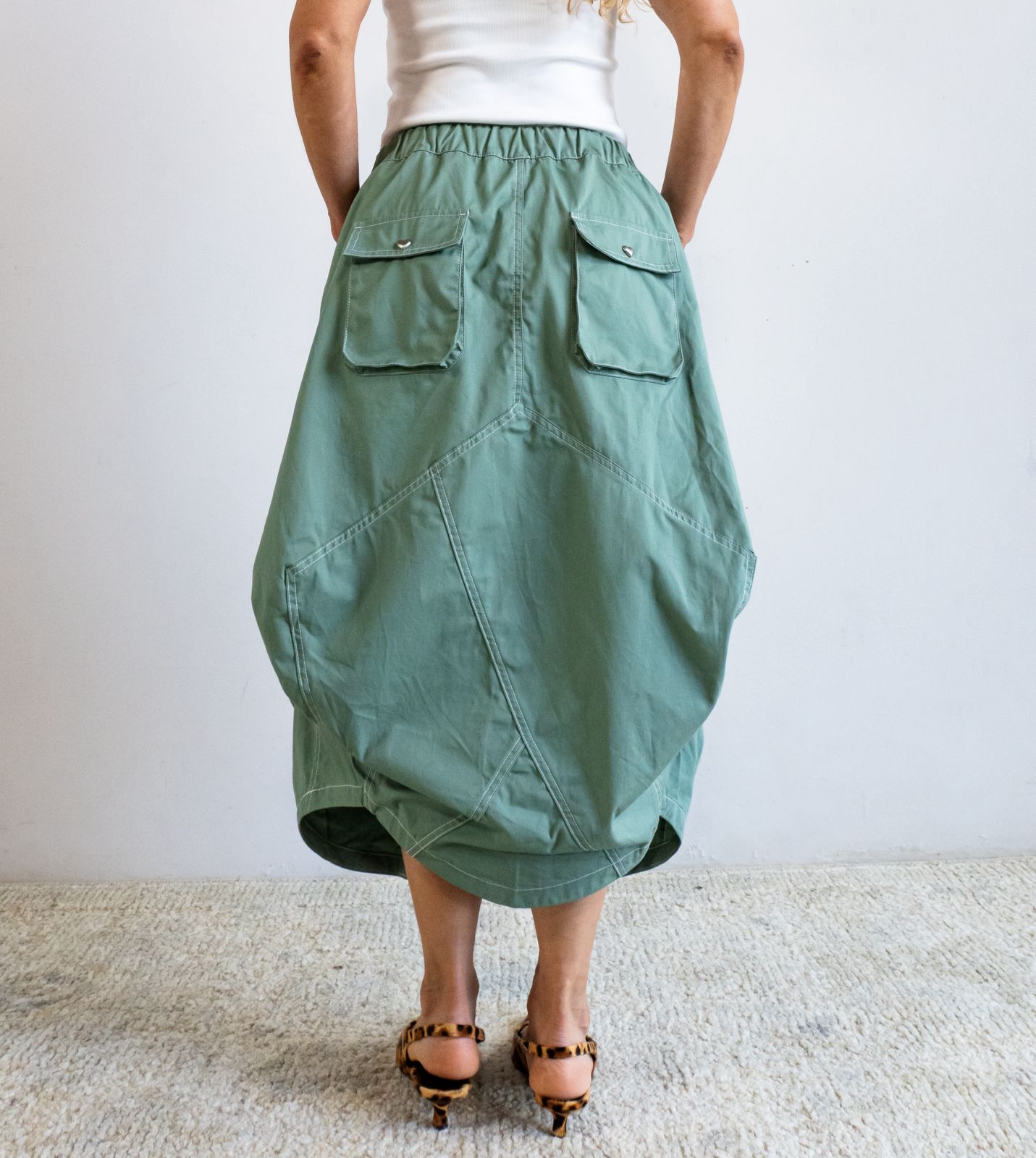 Maxi Falda globo talle alto con cortes asimétricos, bolsillos y cordones tejidos, elaborado en 100% algodón