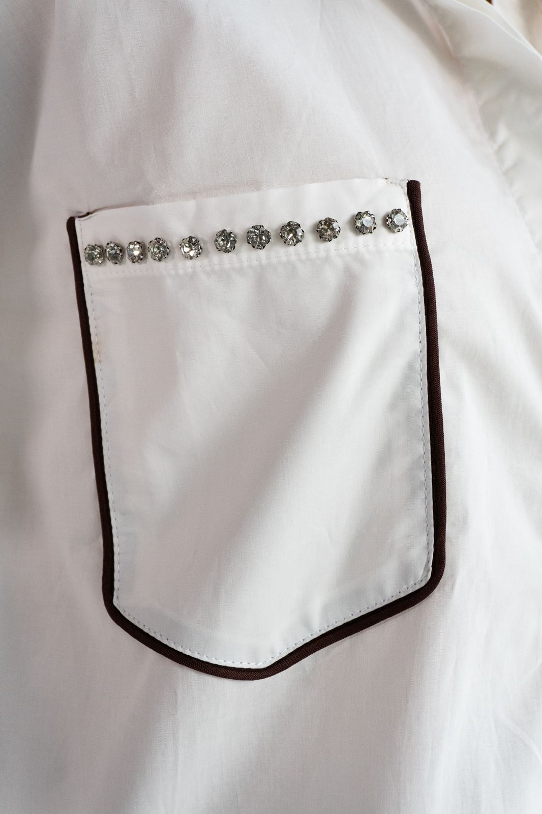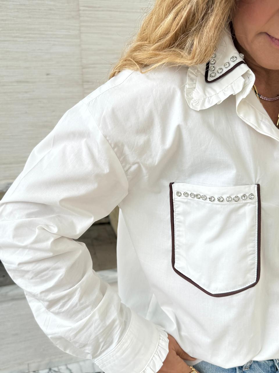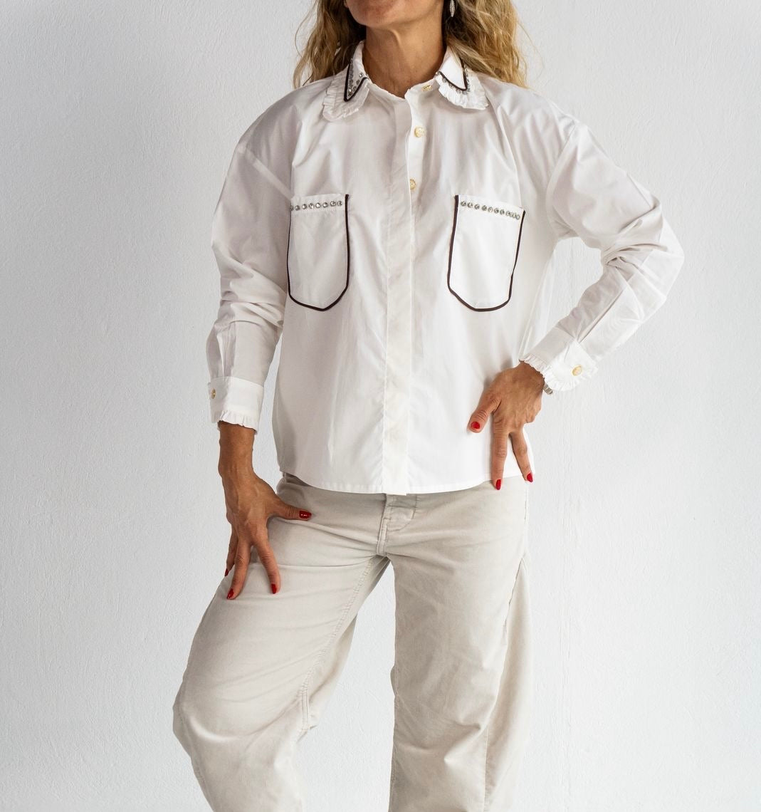 Camisa manga larga elaborada en 100% algodón con apliques, sesgo, bolero en cuello y sus bolsillos delanteros