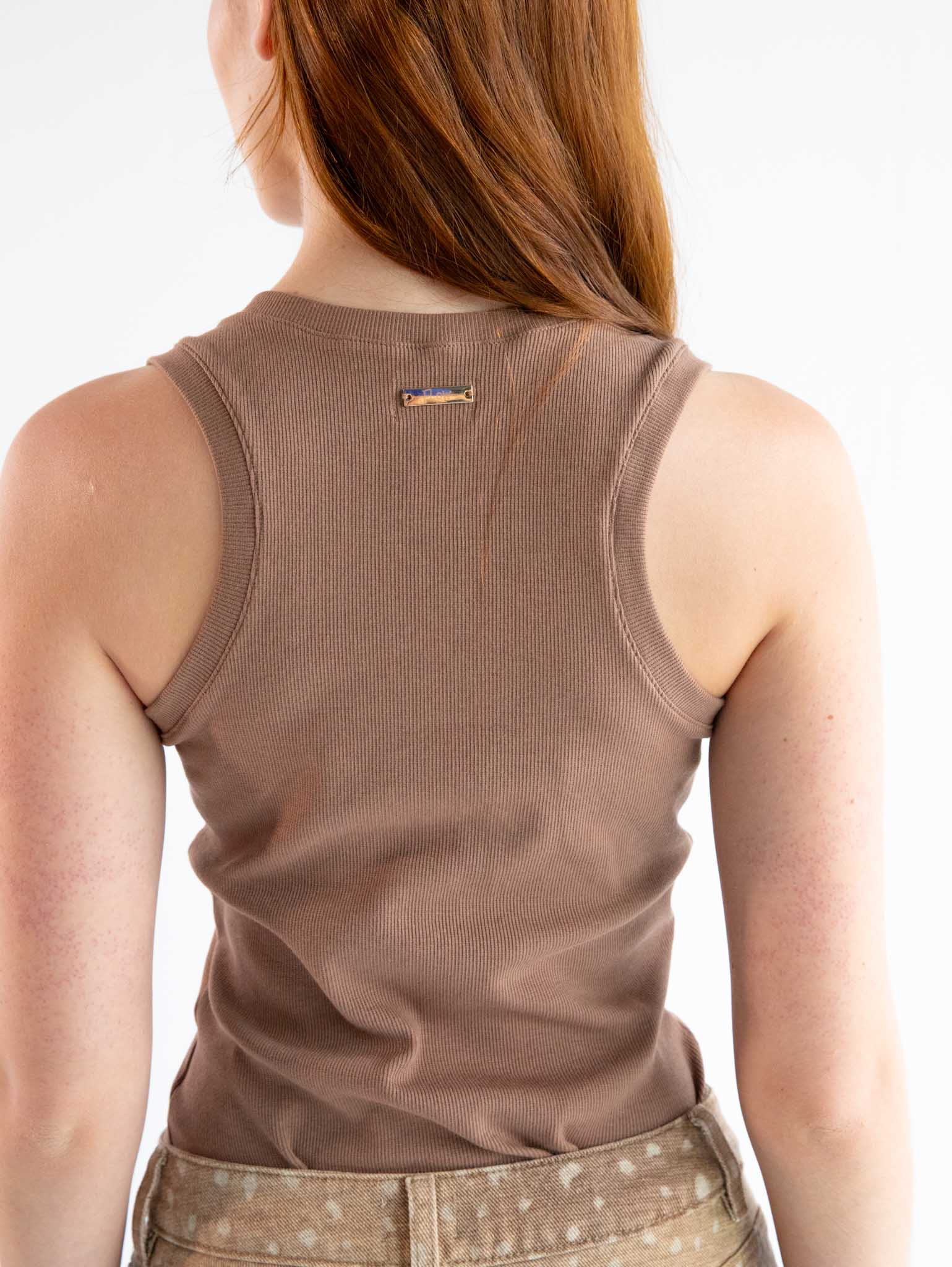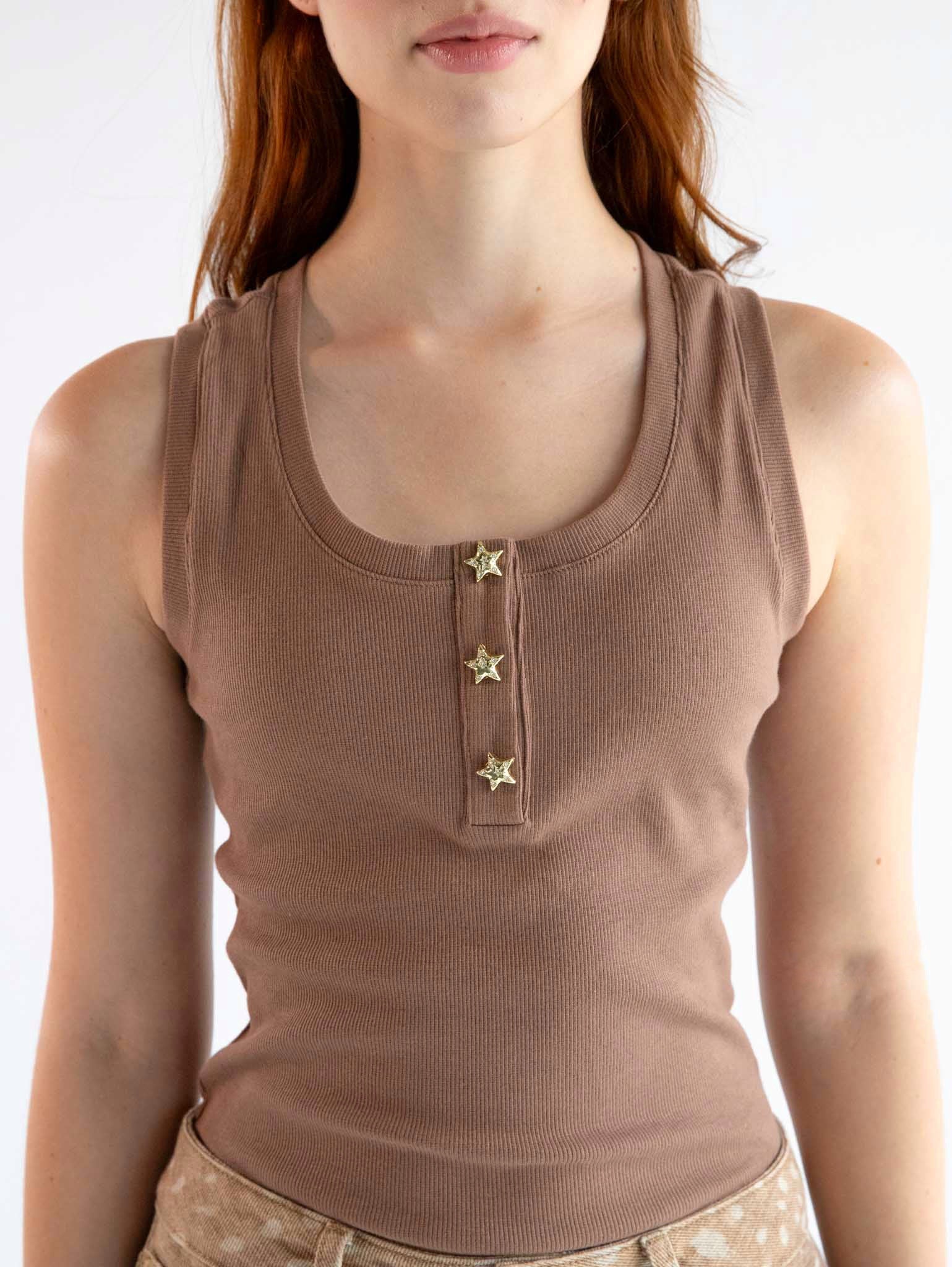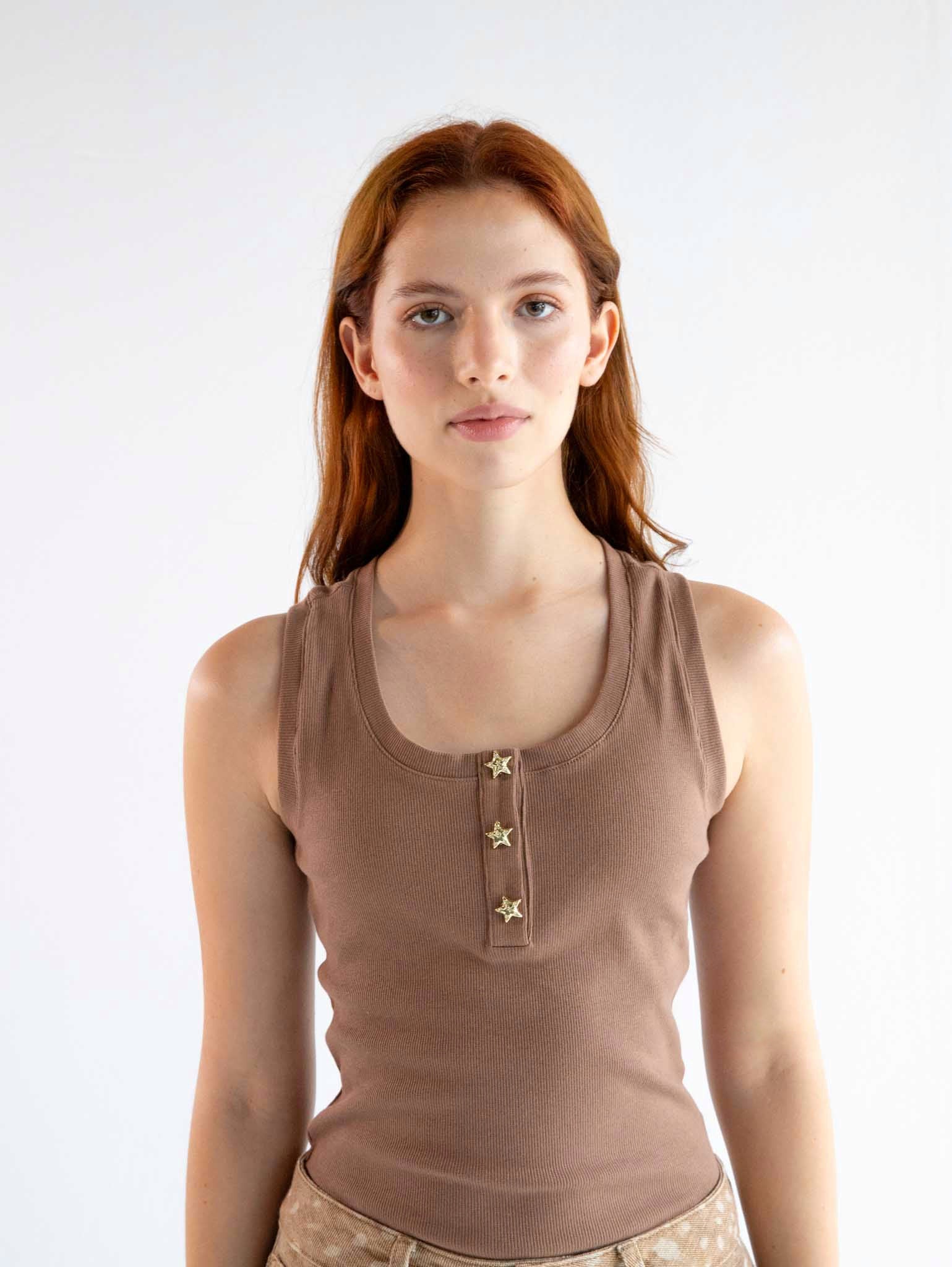 Top rib elaborado en algodón, manga sisa, con cuello redondo y botones en estrella