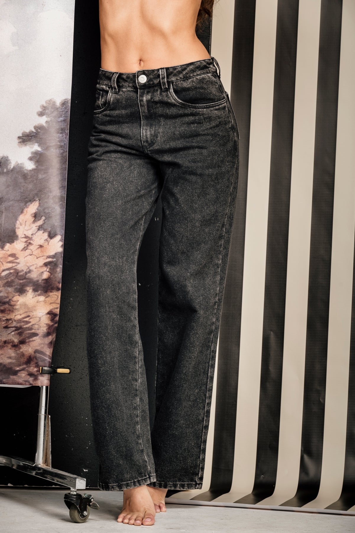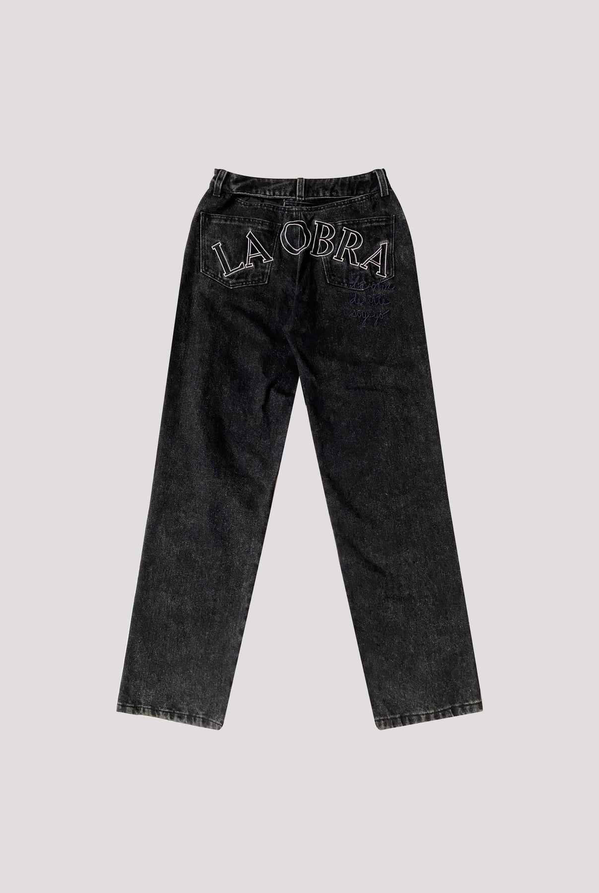 Jean de silueta recta, tiro medio, en índigo rígido 100% algodón, bordado en espalda en hilo algodón