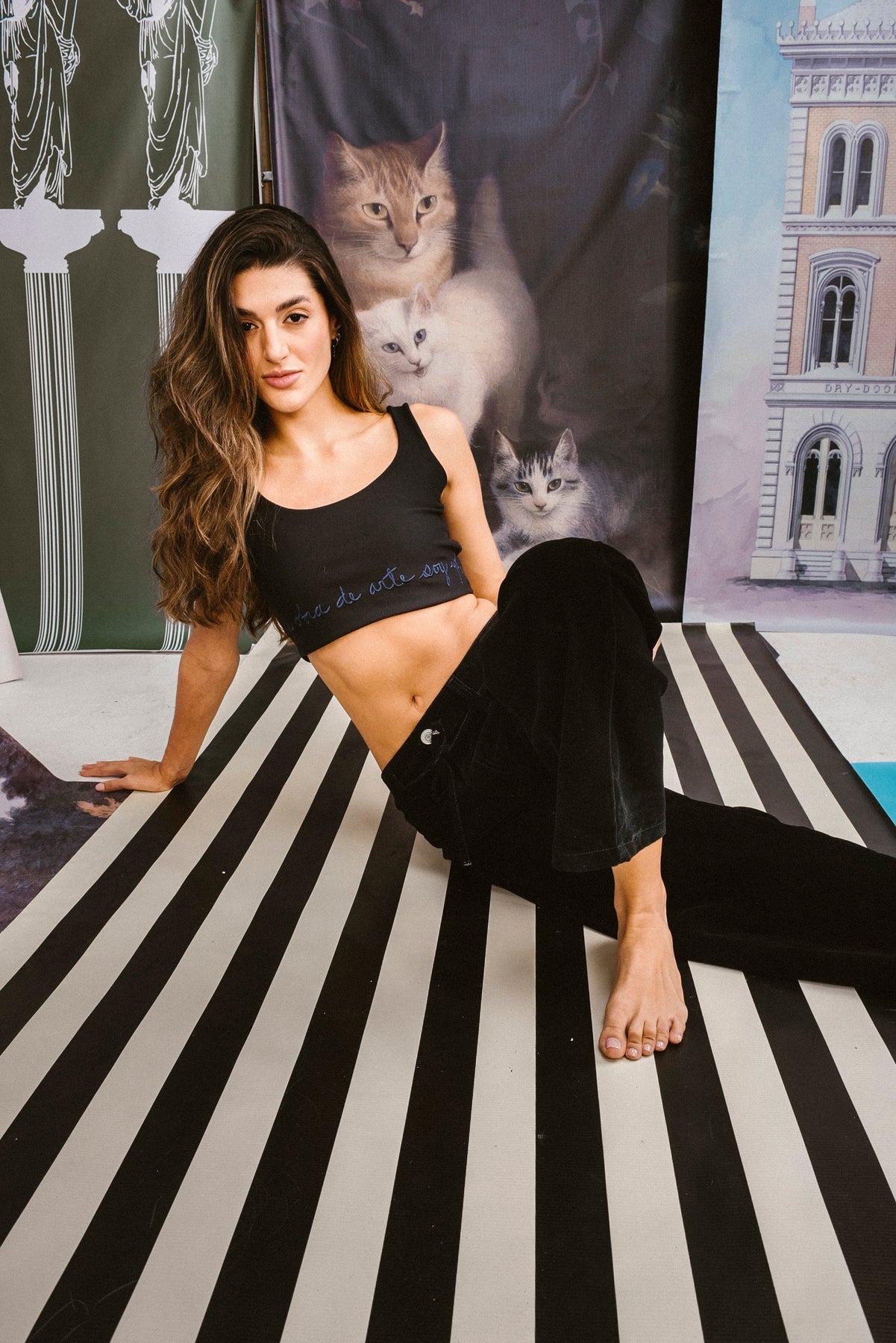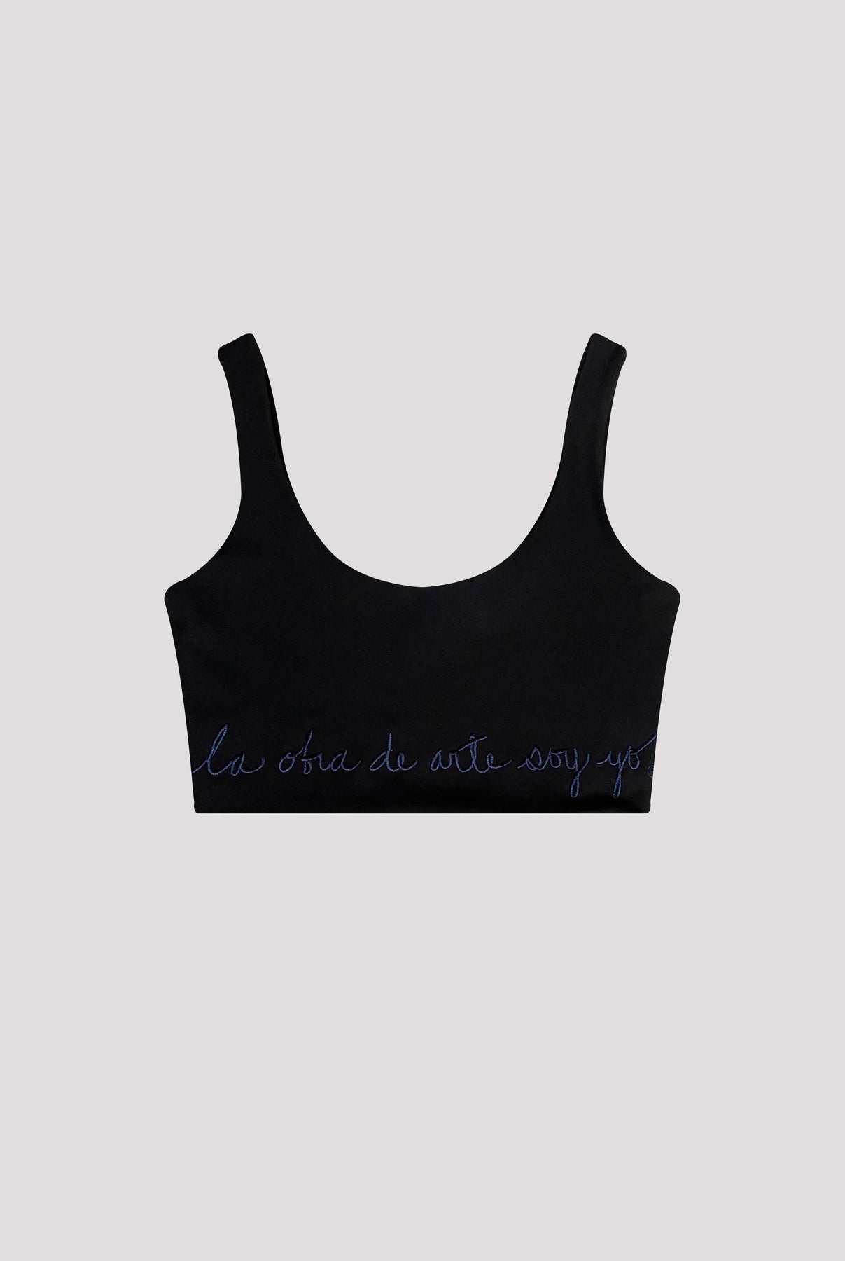 Top clásico color negro, silueta ajustada en tejido punto de roma 100% poliéster, con bordado en parte inferior