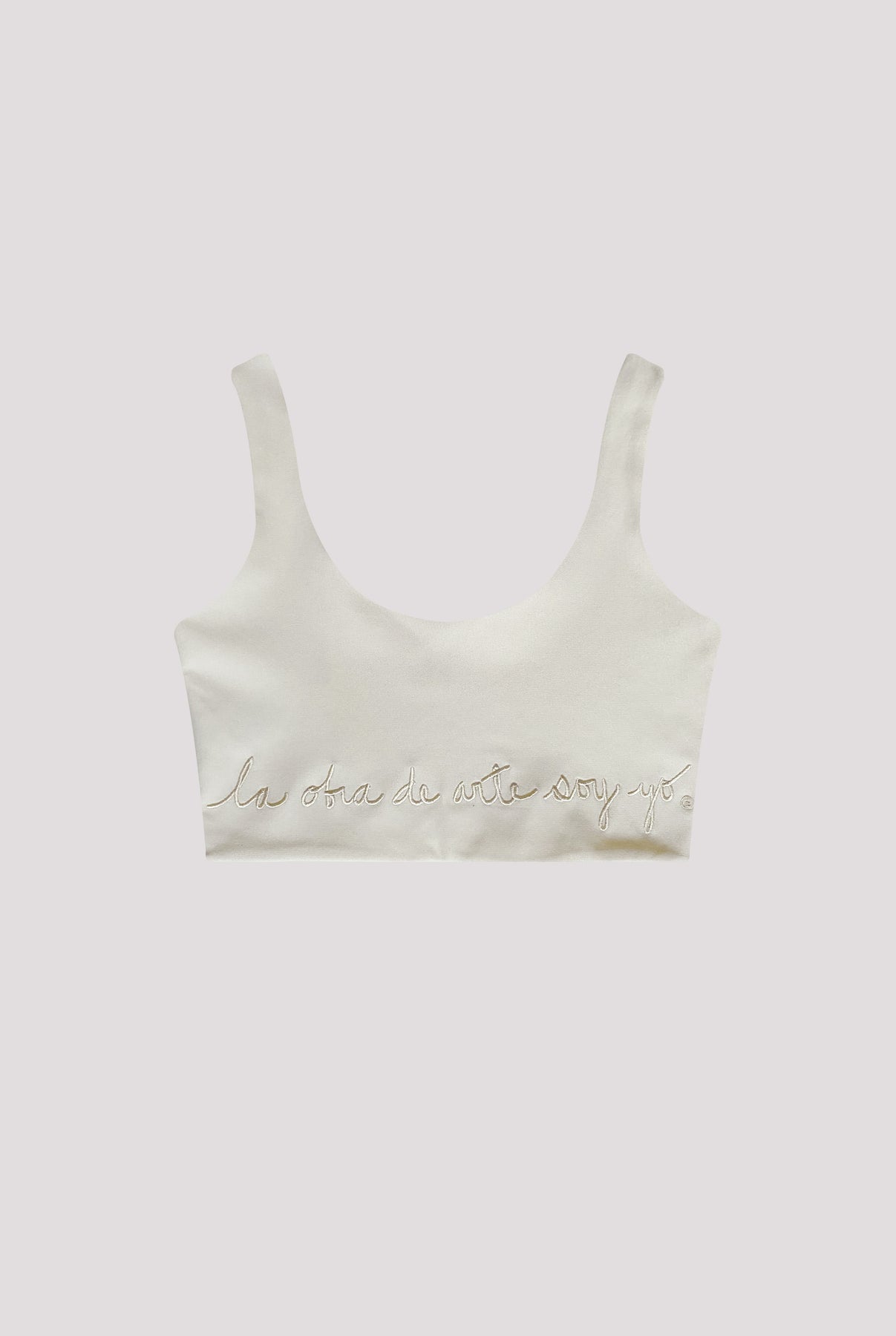 Top clásico color blanco, silueta ajustada en tejido punto de roma 100% poliéster, con bordado en parte inferior