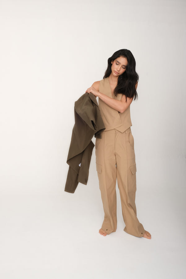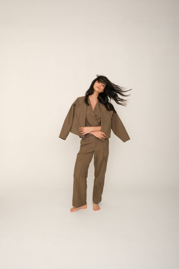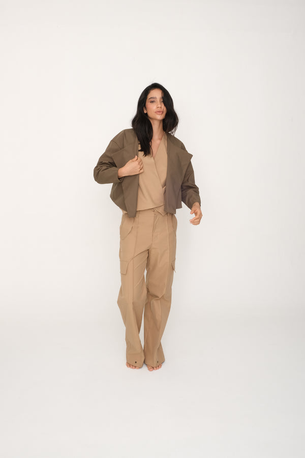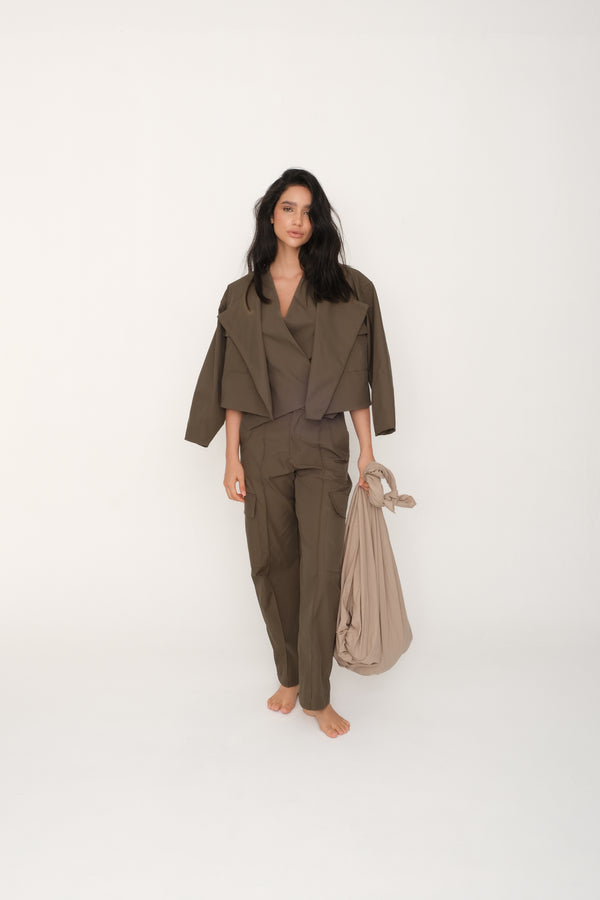 Chaqueta, de escote pico con manga larga. Solapas con corte asimétrico delantero. Bolsillos frontales. Hecho en Colombia.