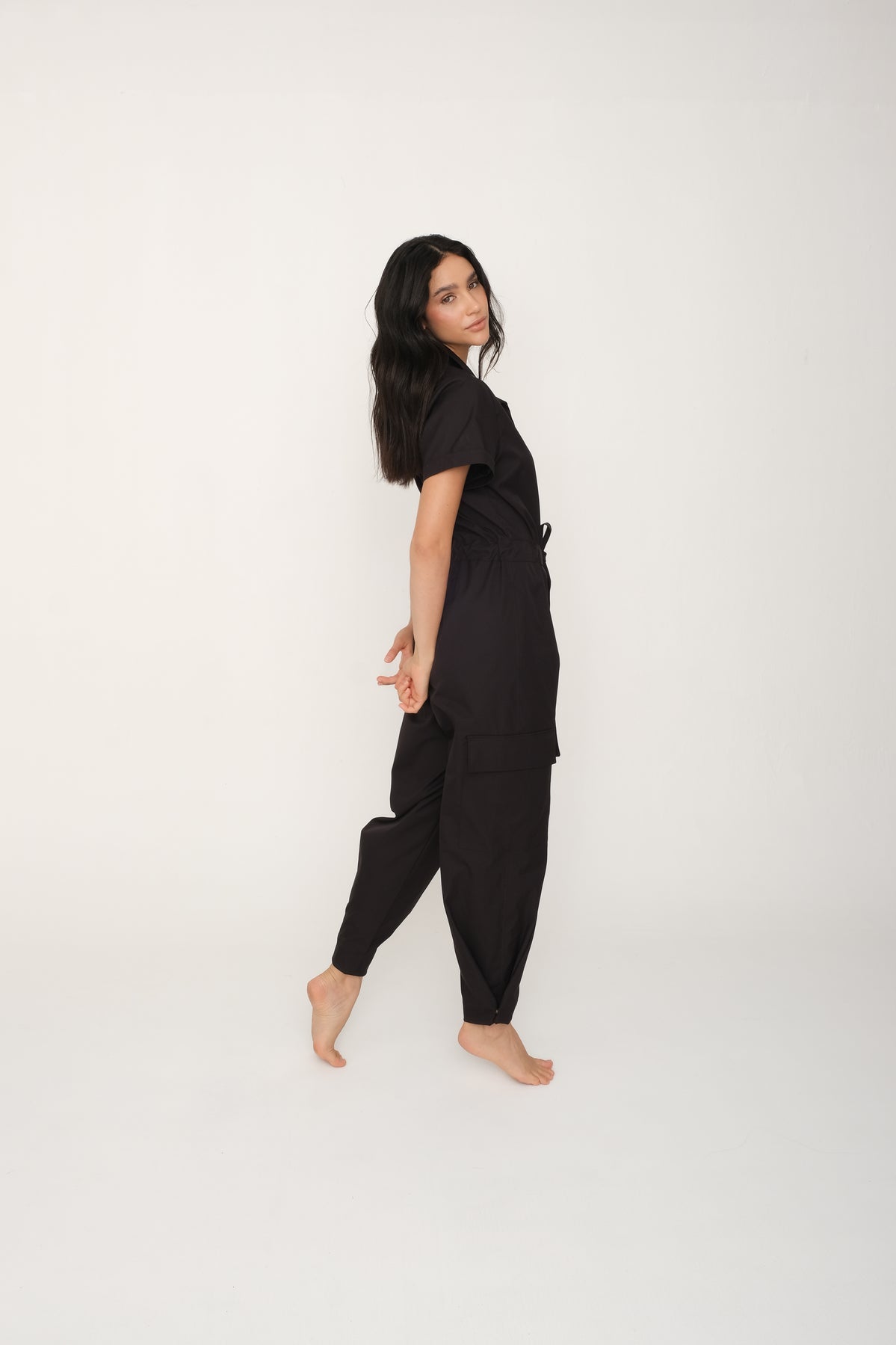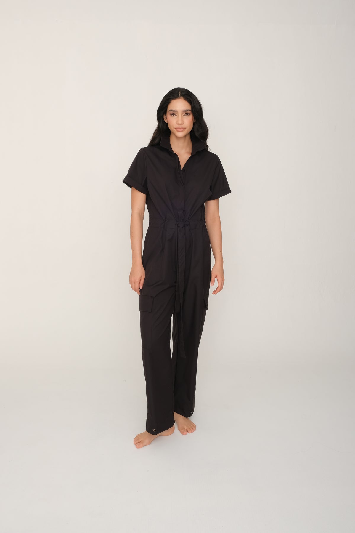 Jumpsuit, cuello solapa recta y escote en V, manga corta (con hombros caídos). Frente con botones laterales. Bolsillos laterales y a media pierna. Cinturón y pasadores. Botones en tiro para ajustar ancho del pantalón. Hecho en Colombia.