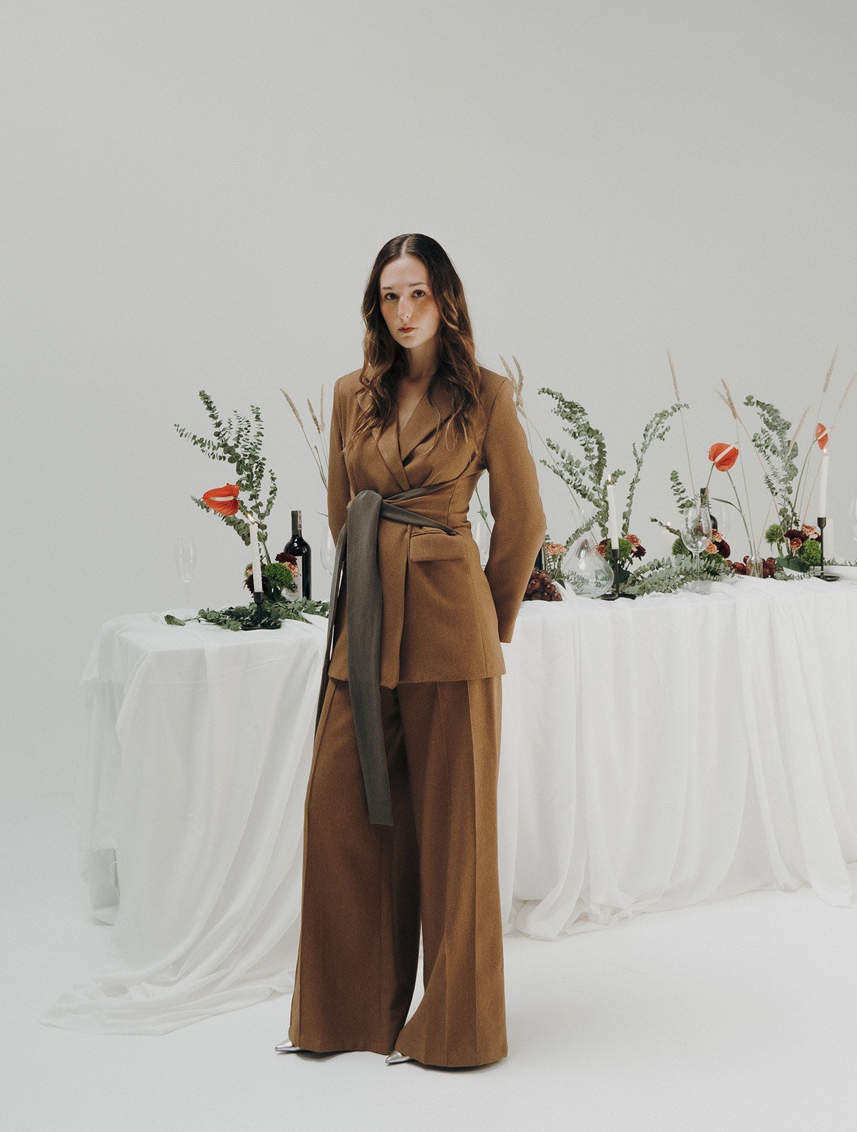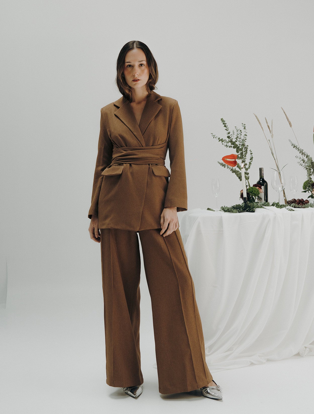Pantalón en paño ligero de corte amplio, con bota ancha. Presenta pespuntes marcados en el delantero y bolsillos de ribete que aportan funcionalidad sin romper la línea limpia del diseño.