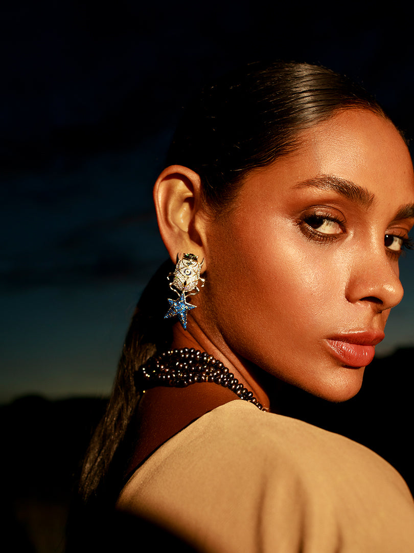 Elaborados en metal bronce con baño de oro de 18 kilates, rodio blanco y rodio negro, y adornados con delicadas incrustaciones de microcristales y cristales facetados en tonos cristal, negro, verde menta, zafiro, aqua y amatista, con técnicas de esmaltado en tonos azul claro y oscuro.