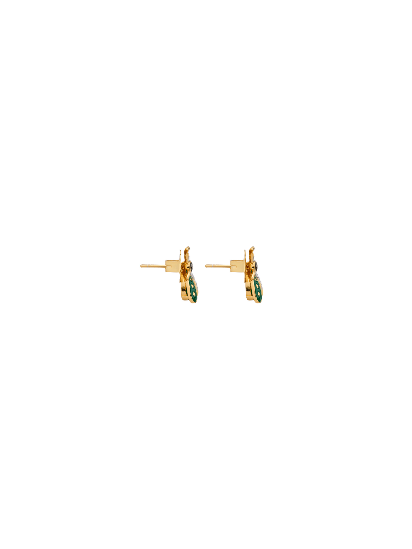Elaborados en metal bronce con baño de oro de 18 kilates, baño de rodio blanco y negro, y adornados con un cristal facetado en tono amatista, enmarcado en alas adornadas con ténicas de esmaltado morado e incrustacion de microcristales en tonos cristal y onyx.