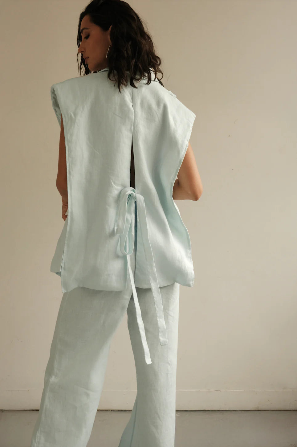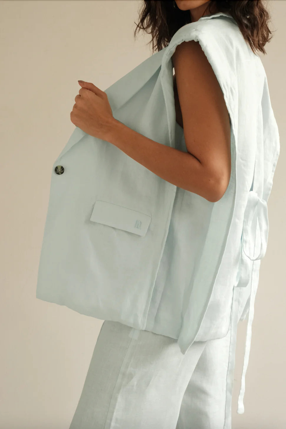 Reinterpretamos un clásico atemporal para darle un twist. Un blazer sin mangas que toma lo mejores detalles de la sastrería y lo adapta a la versatilidad de nuestro día a día. Su silueta oversized y espalda abierta con lazos lo hacen estructurado pero fluido, con la libertad de que lo ajustes según el momento del día.