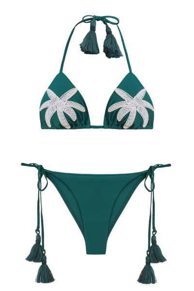 Nuestro top Sage es un top clásico de triangulo hecho con tela suave. Incluye bordado en algodón en frente. Ajustable con amarre en cuello y espalda. Tiene pompones tejidos en las tiras de ajuste. Tiene copas removibles.