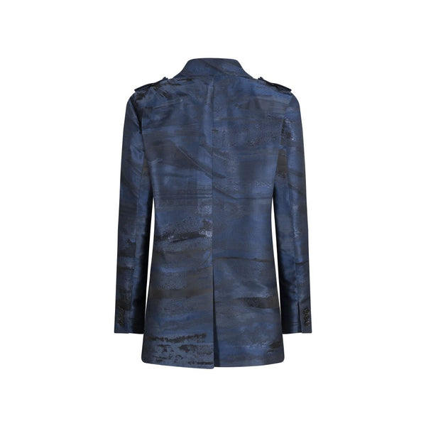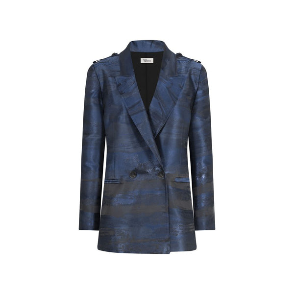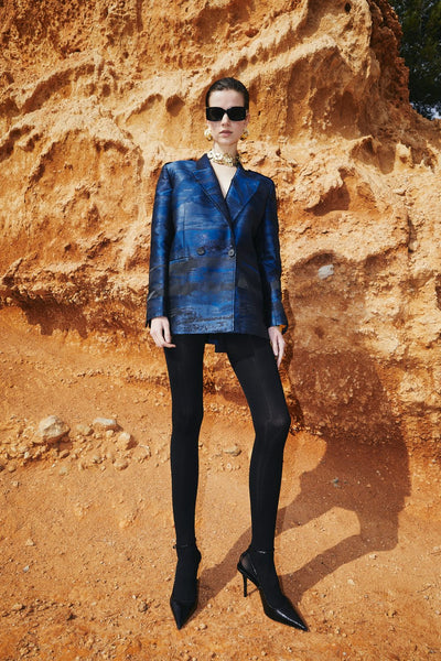 Blazer de fit holgado confeccionado en jacquard verde/azul con cierre frontal de botones. Esta pieza aporta textura y elegancia a cualquier look. La modelo mide 1.76 m y lleva una talla S.