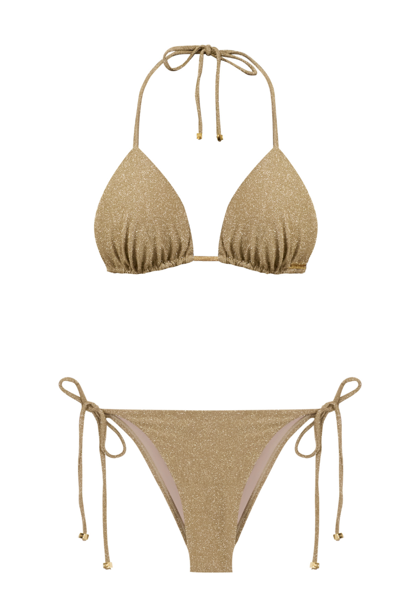 Nuestro Bea bottom es un básico de amarrar con corte moderado hecho en tela brillante con lurex. Tiene accesorios con baño de oro en las tiras de ajuste. Composición de la tela: 77% Poliamida 14% Elastano 9% Lurex.