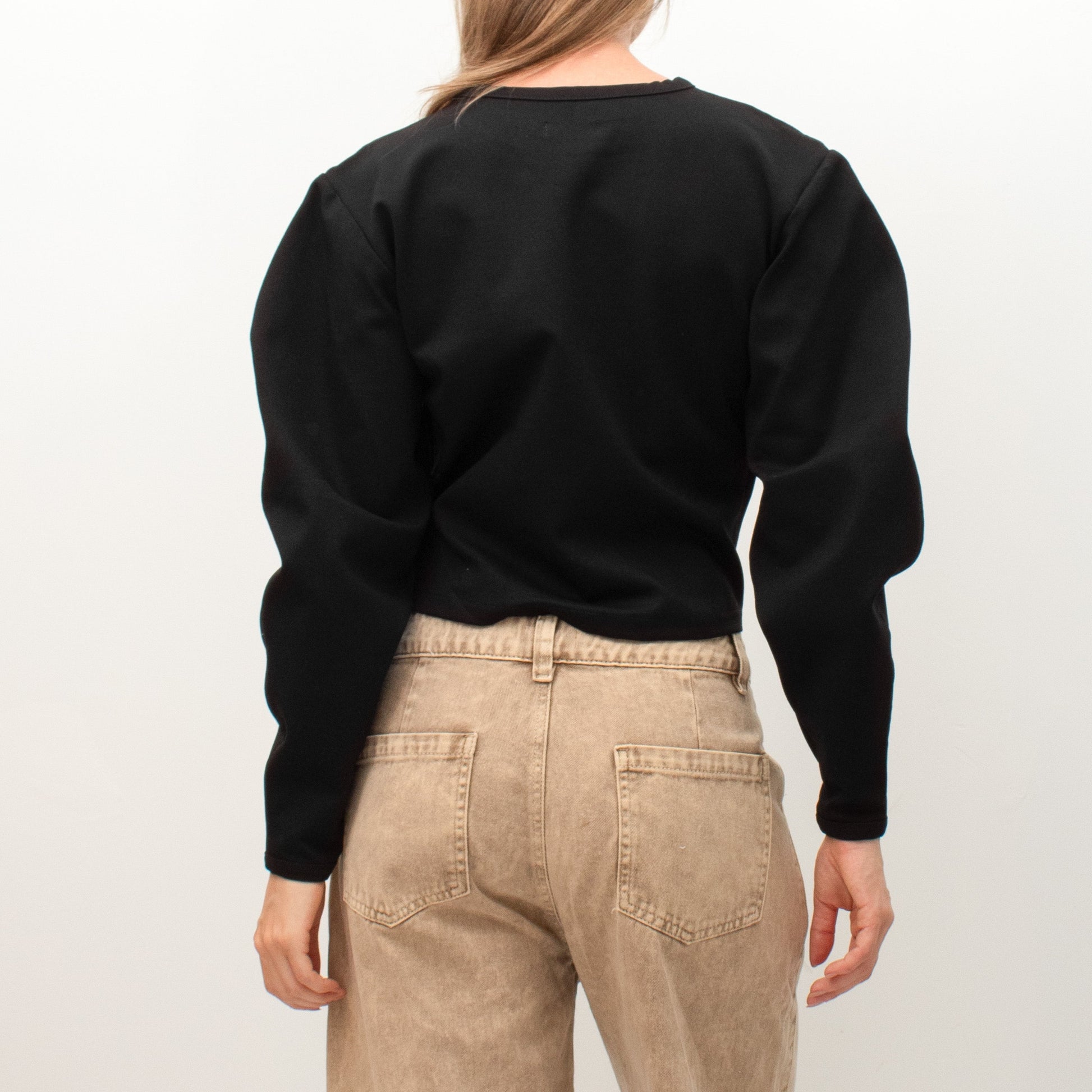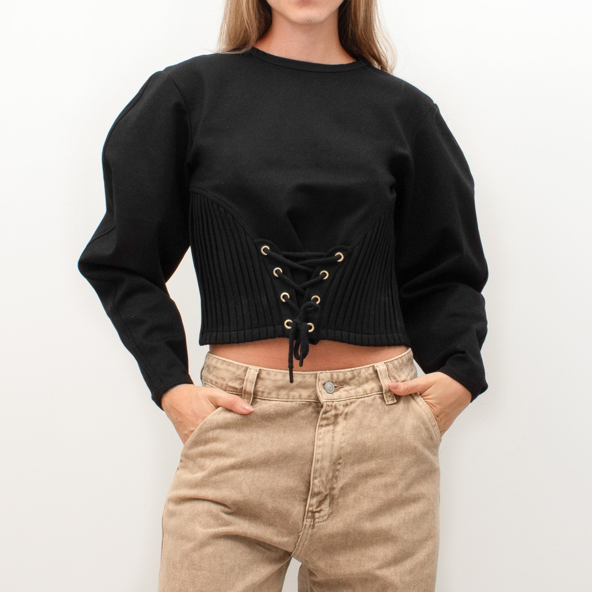 - Buzo de manga larga con cuello redondo, silueta semi-entallada, diseño con corsé & decorados con alforzas artesanales.
