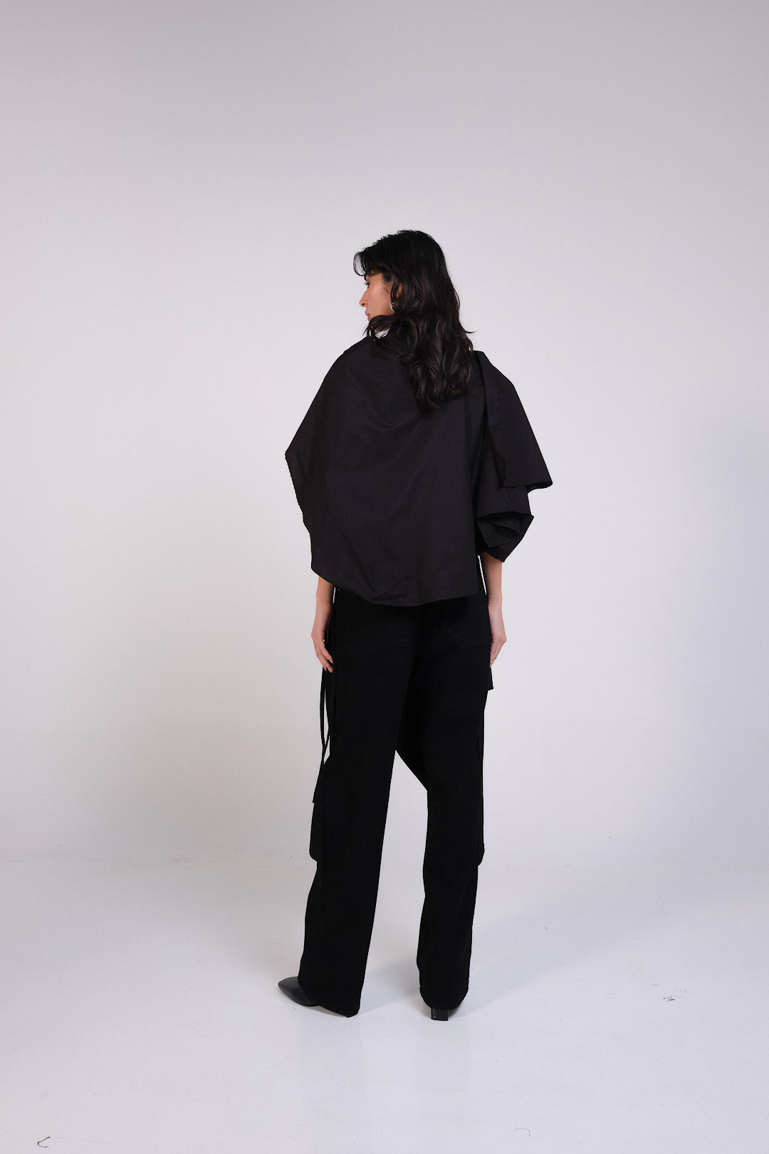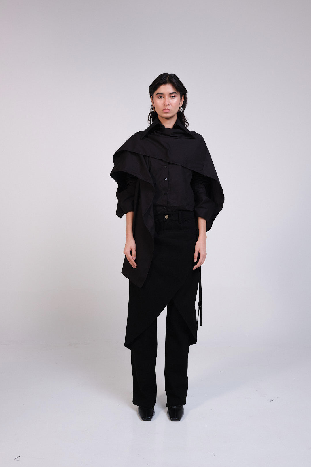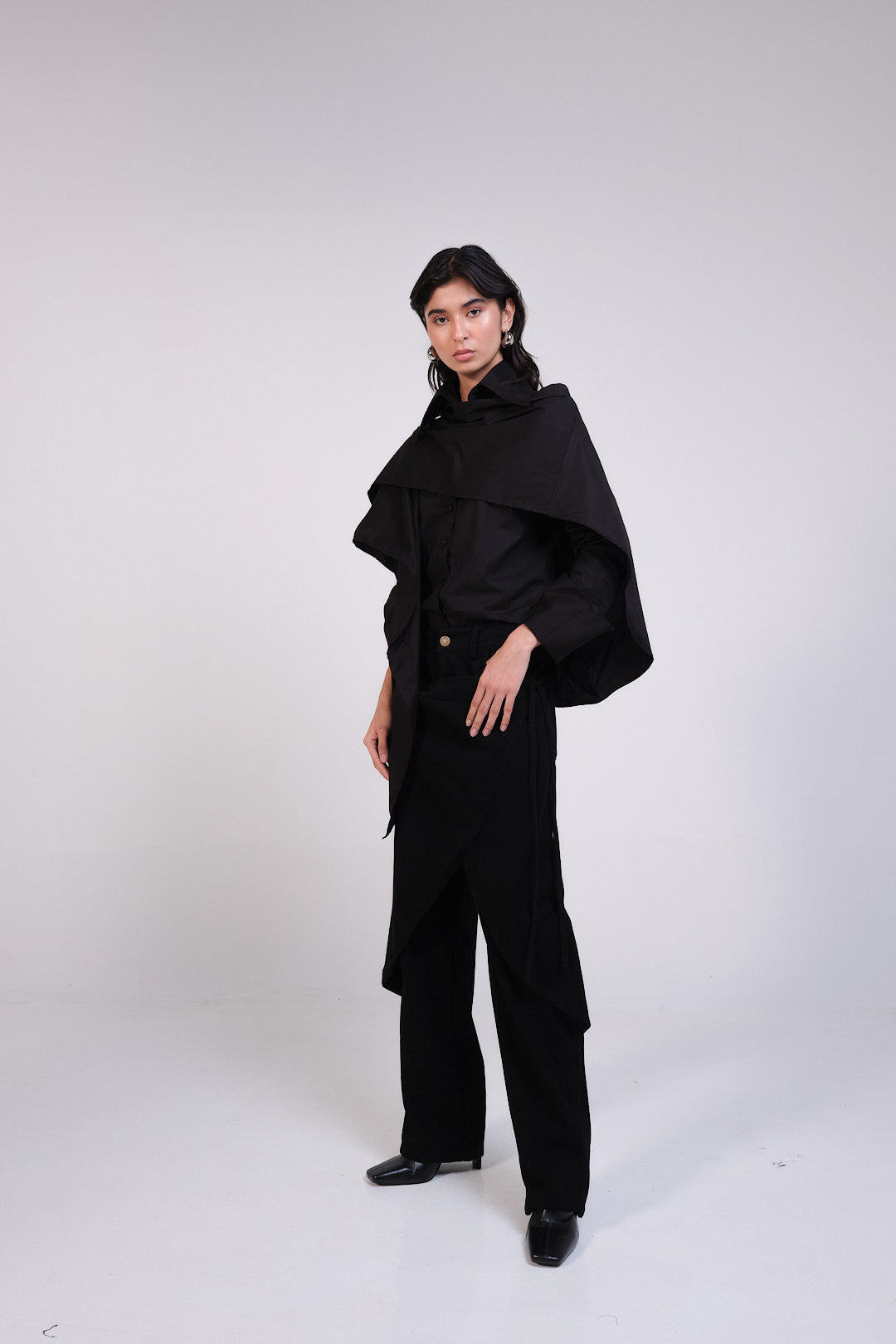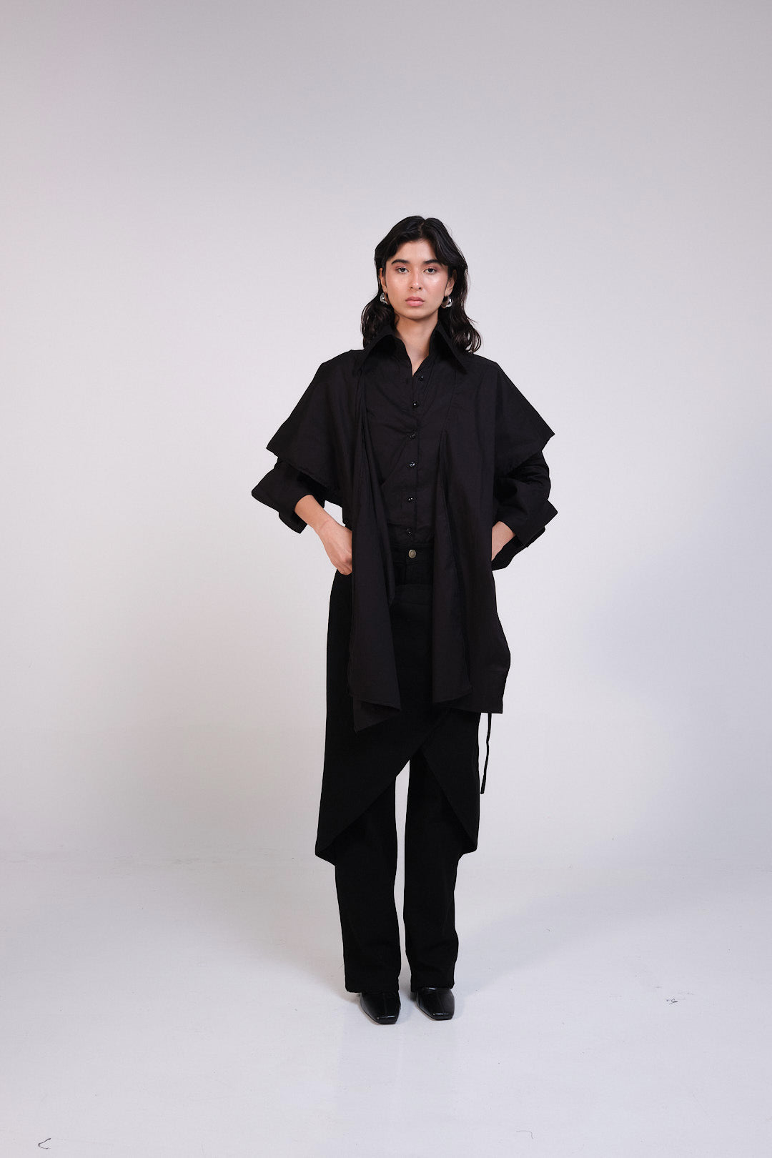 Camisa de popelina negra, manga larga con abotonadura frontal y capa adicional removible.