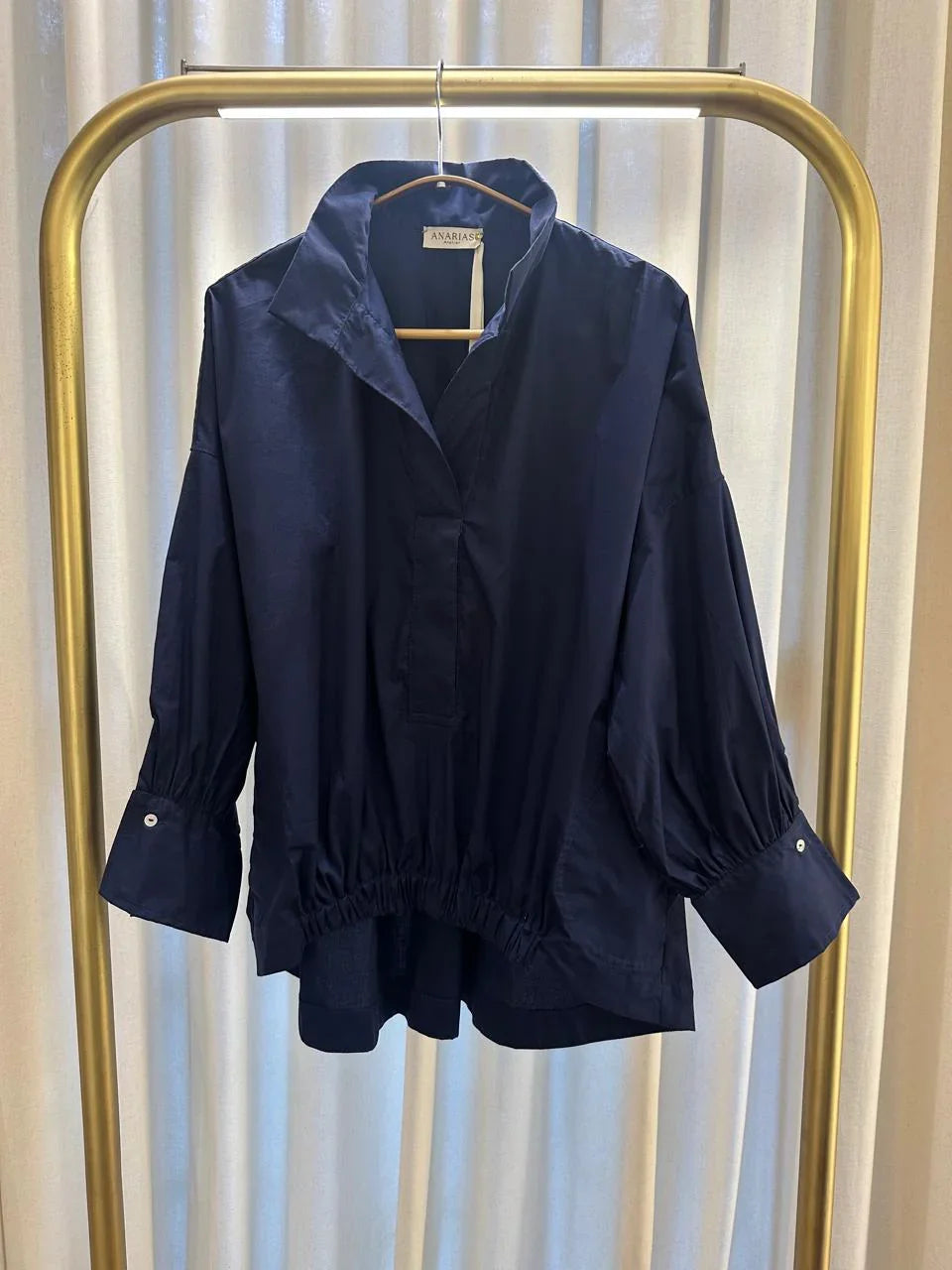Camisa oversize, manga larga rodada y de puños gruesos, cuello alto, resorte adelante que reduce un poco de volumen y bolsillos laterales, prense trasero y más larga atrás que adelante. ¡Ideal para tenerla en el closet y combinarla tanto para ocasiones formales o informales! El principal atractivo de esta prenda está en todos los detalles que la hacen clásica pero no convencional, su cuello que puede ponerse parado o abierto, sus puños gruesos que te permite usarla manga larga o recogida y su resorte que le da un toque especial.