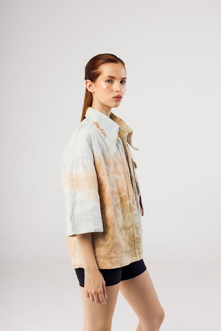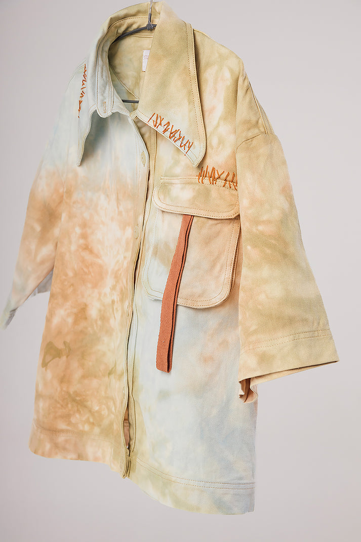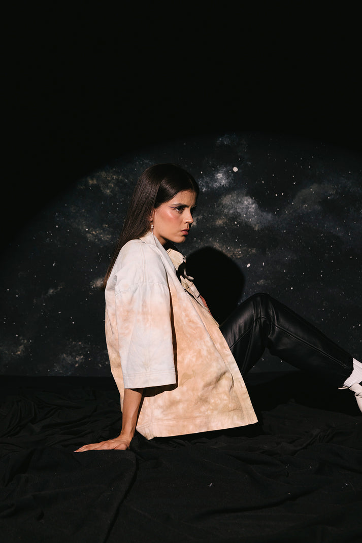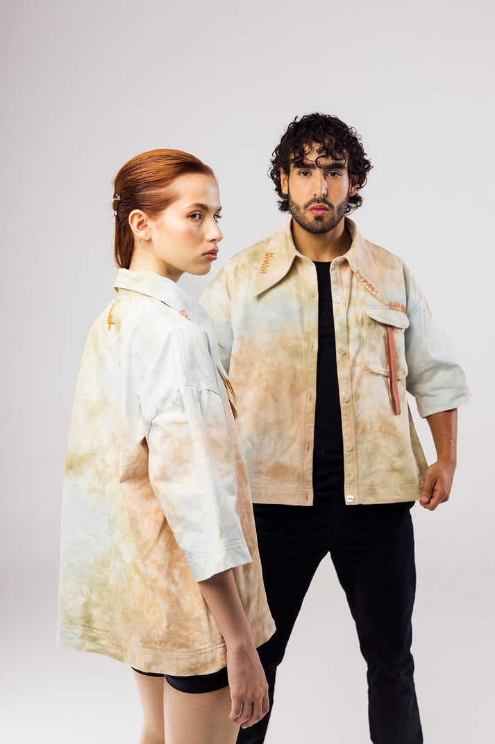 Una camisa teñida artesanalmente con técnica Ice dye y bordada tanto en la espalda con el signo del planeta, como en su frente con puntadas a mano.
