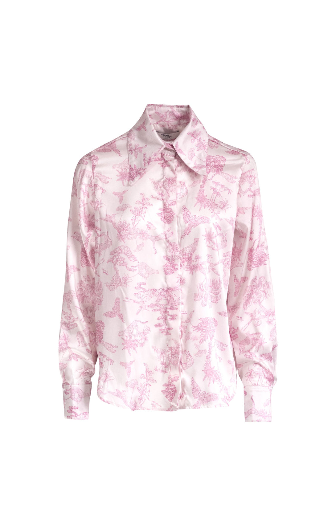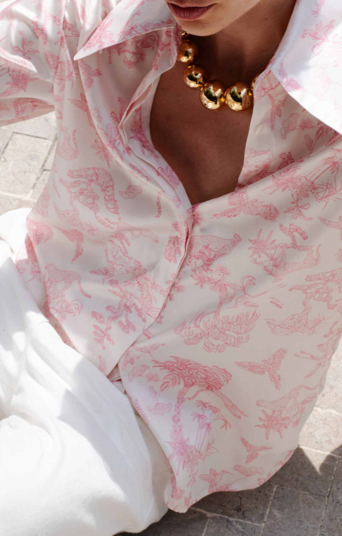 Camisa clásica de cuello camisero imponente, confeccionada en un twill de poliéster reciclado. Su estampado toile de jouy, con elegantes guepardos y delicados colibríes. La modelo lleva una talla S y mide 1,75. Esta prenda es hecha en Colombia en condiciones de trabajo éticas.