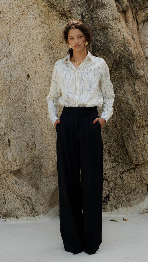 Camisa de manga larga con cuello clásico. Es una pieza statement dentro de la colección, con un estampado característico de cuerdas que destaca en la línea, además del logo de Atelier Crump. Una prenda sofisticada, vaporosa, fresca y divertida. La modelo lleva una talla S y mide 1,75. Esta prenda es hecha en Colombia en condiciones de trabajo éticas.