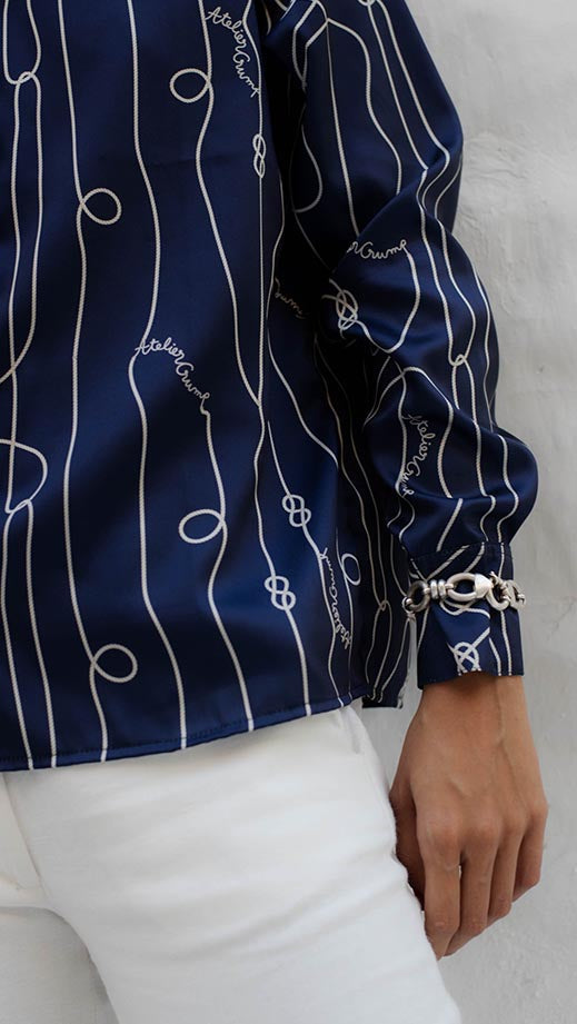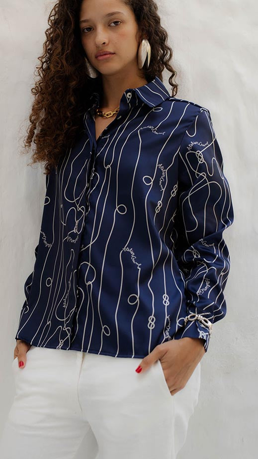 Camisa de manga larga con cuello clásico. Es una pieza statement dentro de la colección, con un estampado característico de cuerdas que destaca en la línea, además del logo de Atelier Crump. Una prenda sofisticada, vaporosa, fresca y divertida. La modelo lleva una talla S y mide 1,75. Esta prenda es hecha en Colombia en condiciones de trabajo éticas.