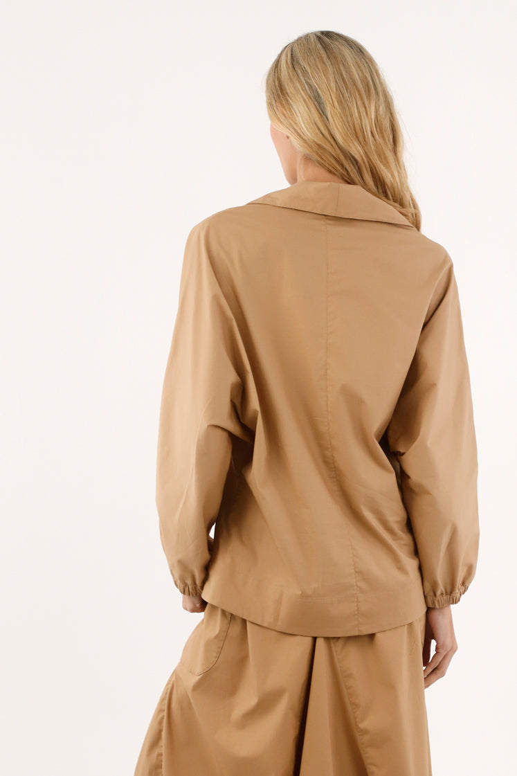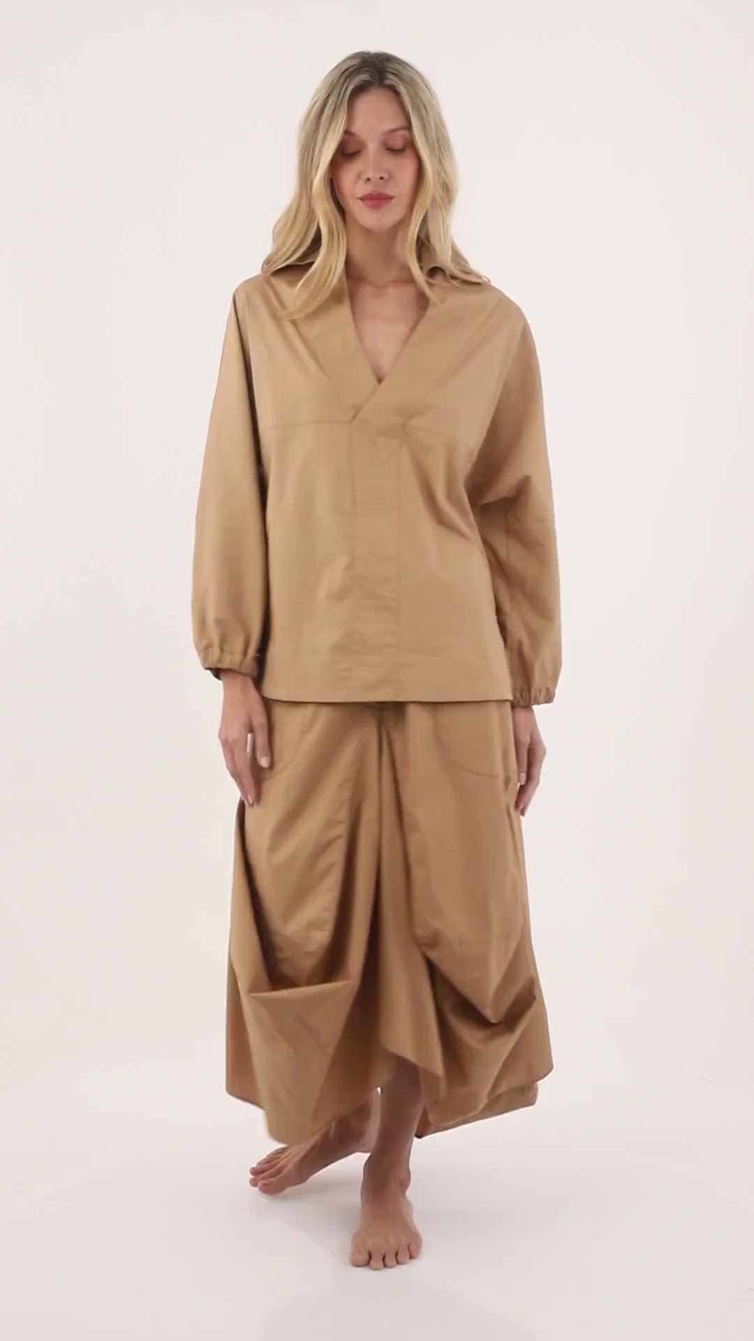 Camisa escote en V con cuello, manga ranglan terminada con resorte y largo tres cuartos. Con pieza al final y aberturas laterales para usar por dentro o por fuera ¡Ideal para tenerla en el closet y combinarla tanto para ocasiones formales o informales con jeans!