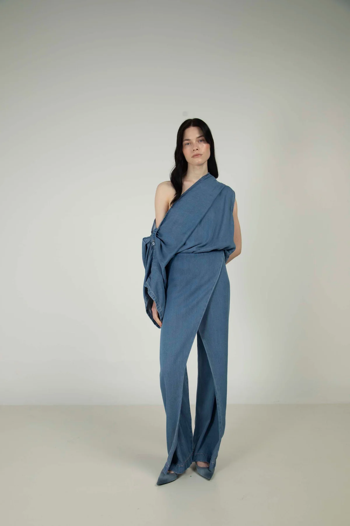 Blusa en denim delgado asimétrica con manga derecha larga con botón y tira para ajustar.