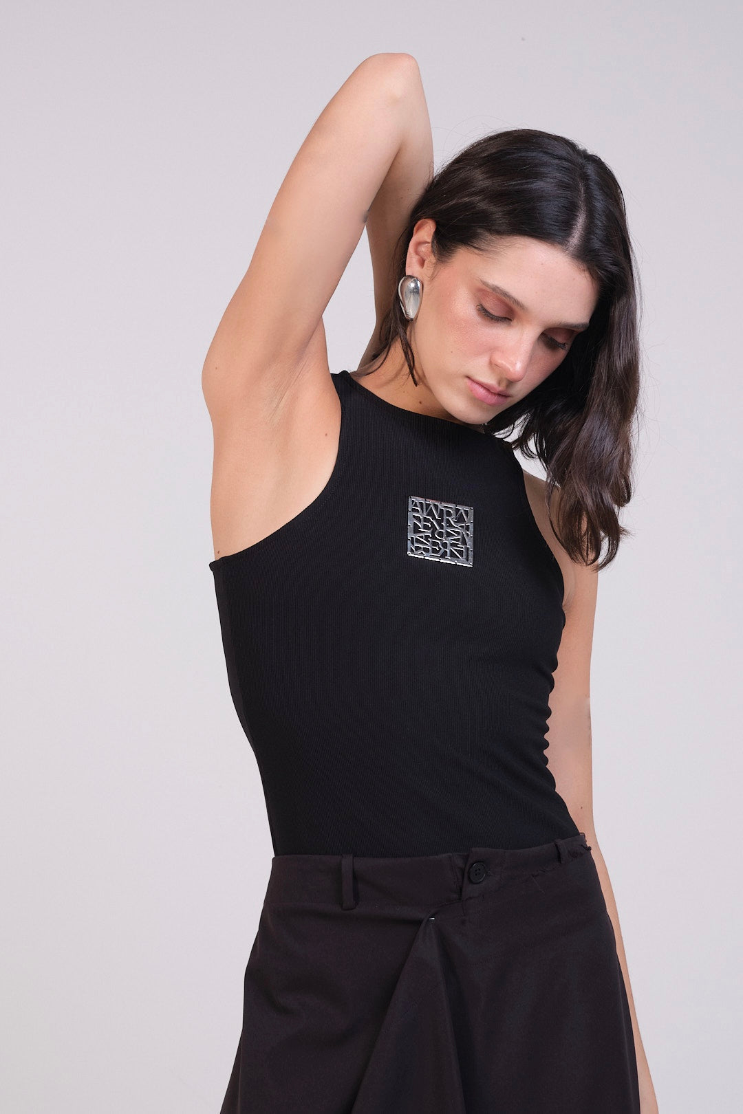 Tank Top en rib negra con dije metálico de "A MI MANERA" en la parte delantera.