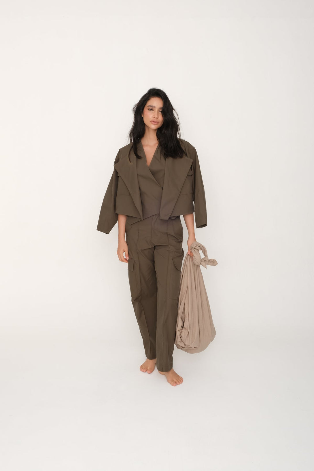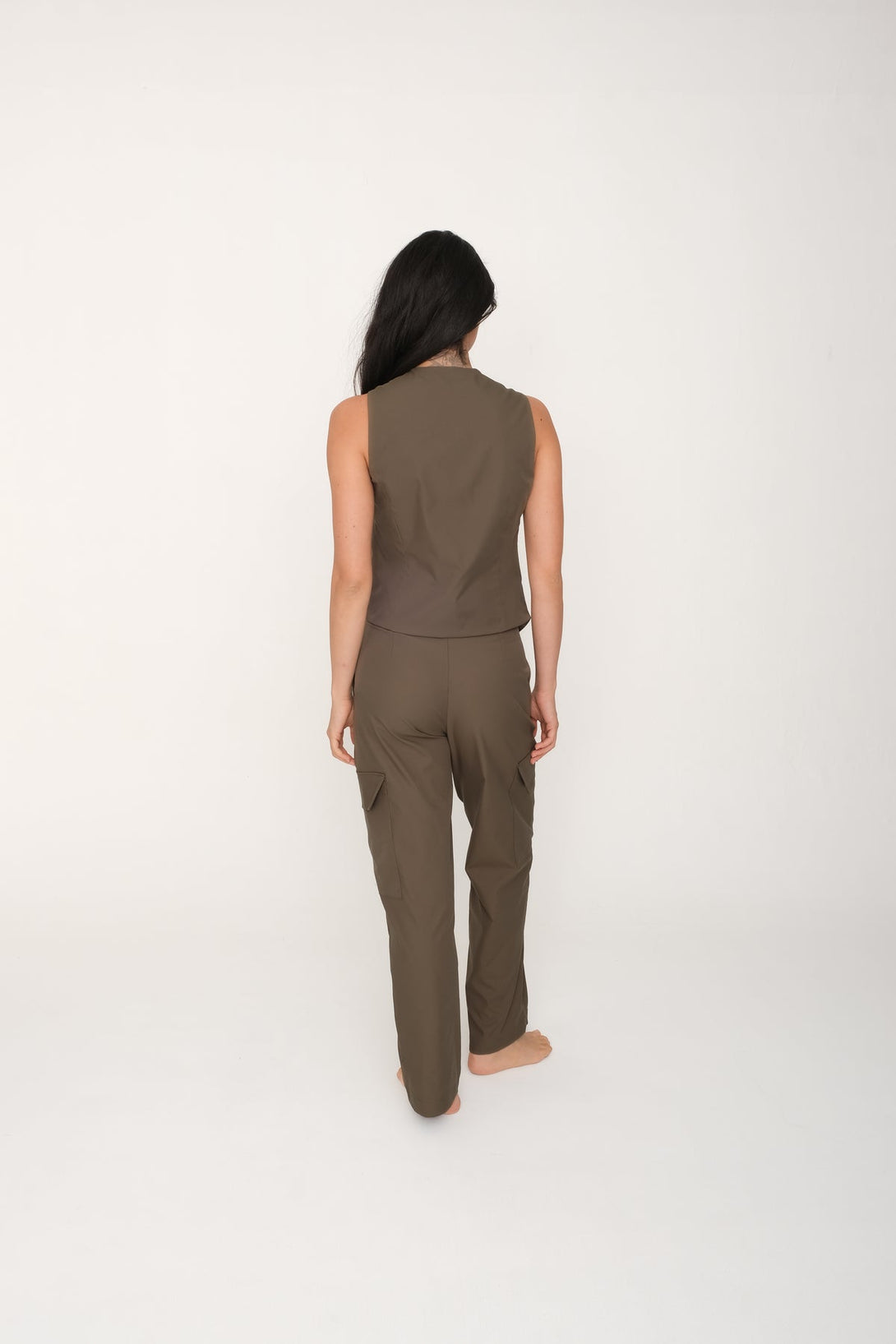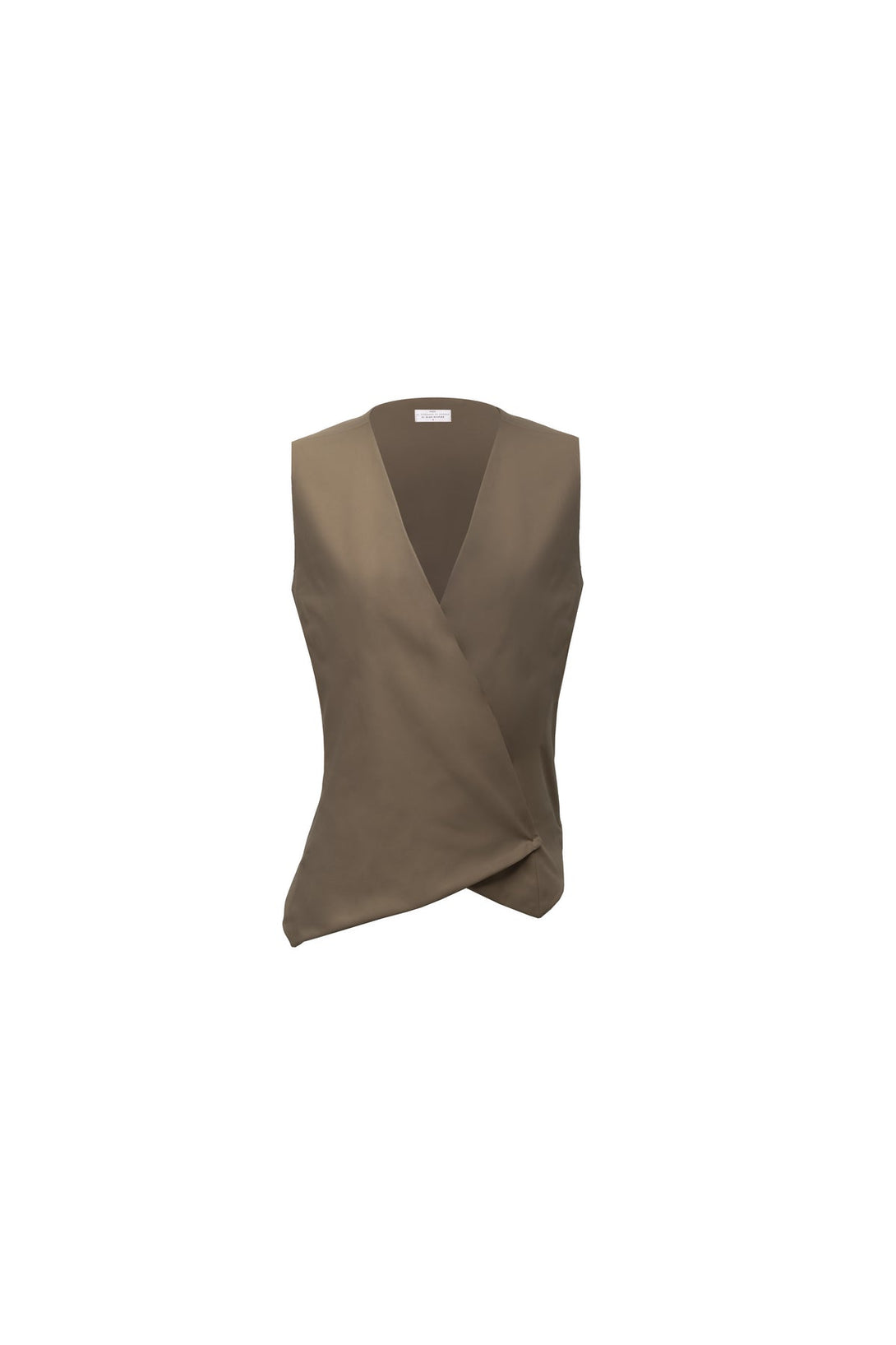 Chaleco, de escote pico con manga sisa. Corte asimétrico delantero. Cierre frontal cruzado con botón interno. Hecho en Colombia.