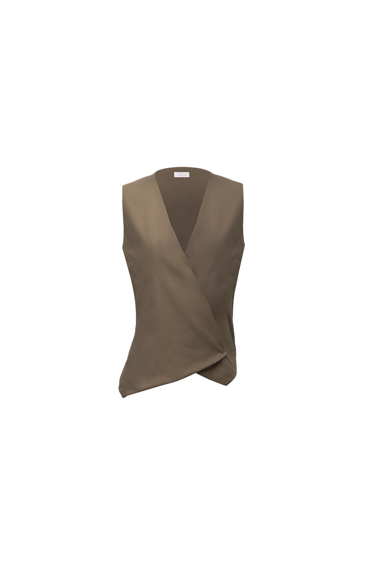 Chaleco, de escote pico con manga sisa. Corte asimétrico delantero. Cierre frontal cruzado con botón interno. Hecho en Colombia.