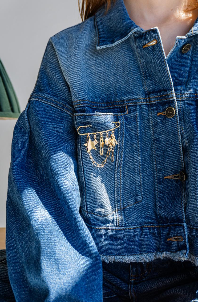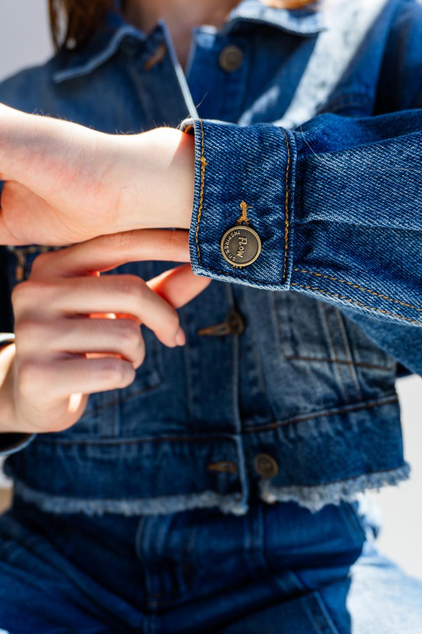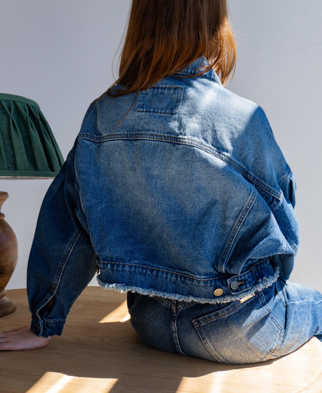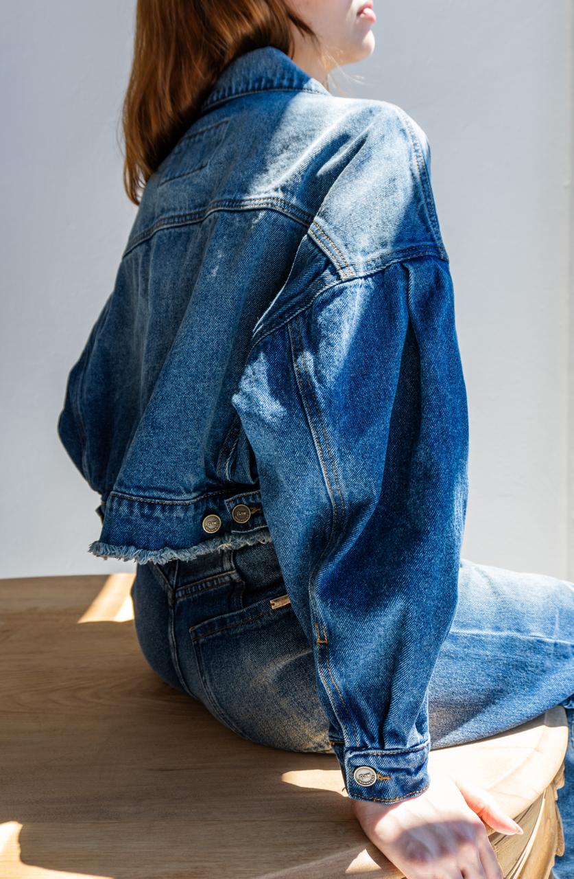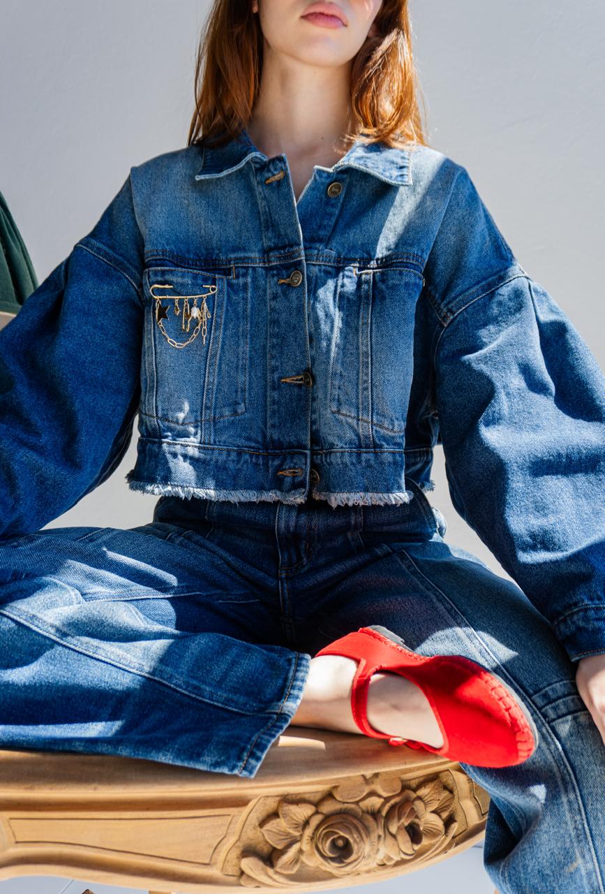 Chaqueta tipo cropped en denim con acabado gamuza, de textura suave y apariencia aterciopelada. Silueta corta y estructurada que estiliza la figura. Mangas largas embombadas con pinzas para volumen definido. Cierre frontal con botones metálicos y bolsillos funcionales en el pecho. Costuras visibles para mayor soporte estructural.