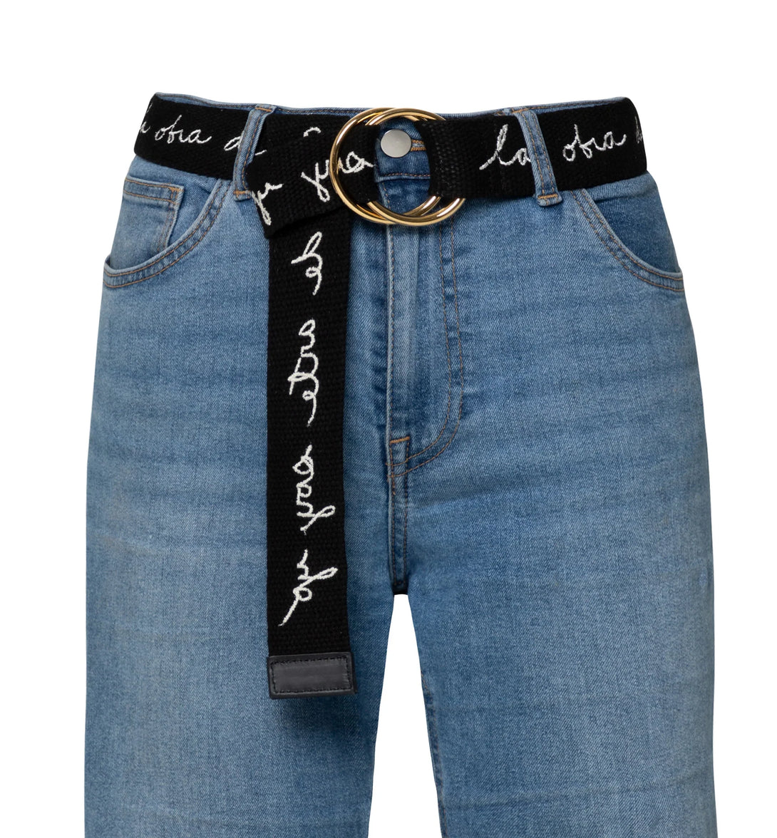 Cinturón en algodón con punteras en 100% cuero y argollas con baño de oro.