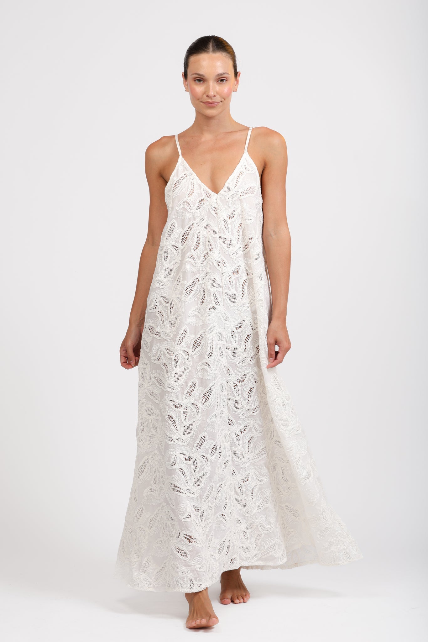 Vestido largo y ancho con escote en V y cargaderas ajustables. Hecho en tela de algodón con bordado.