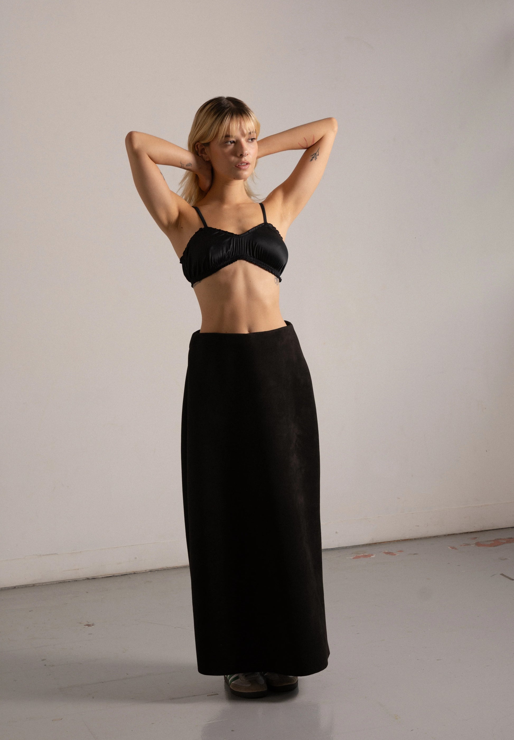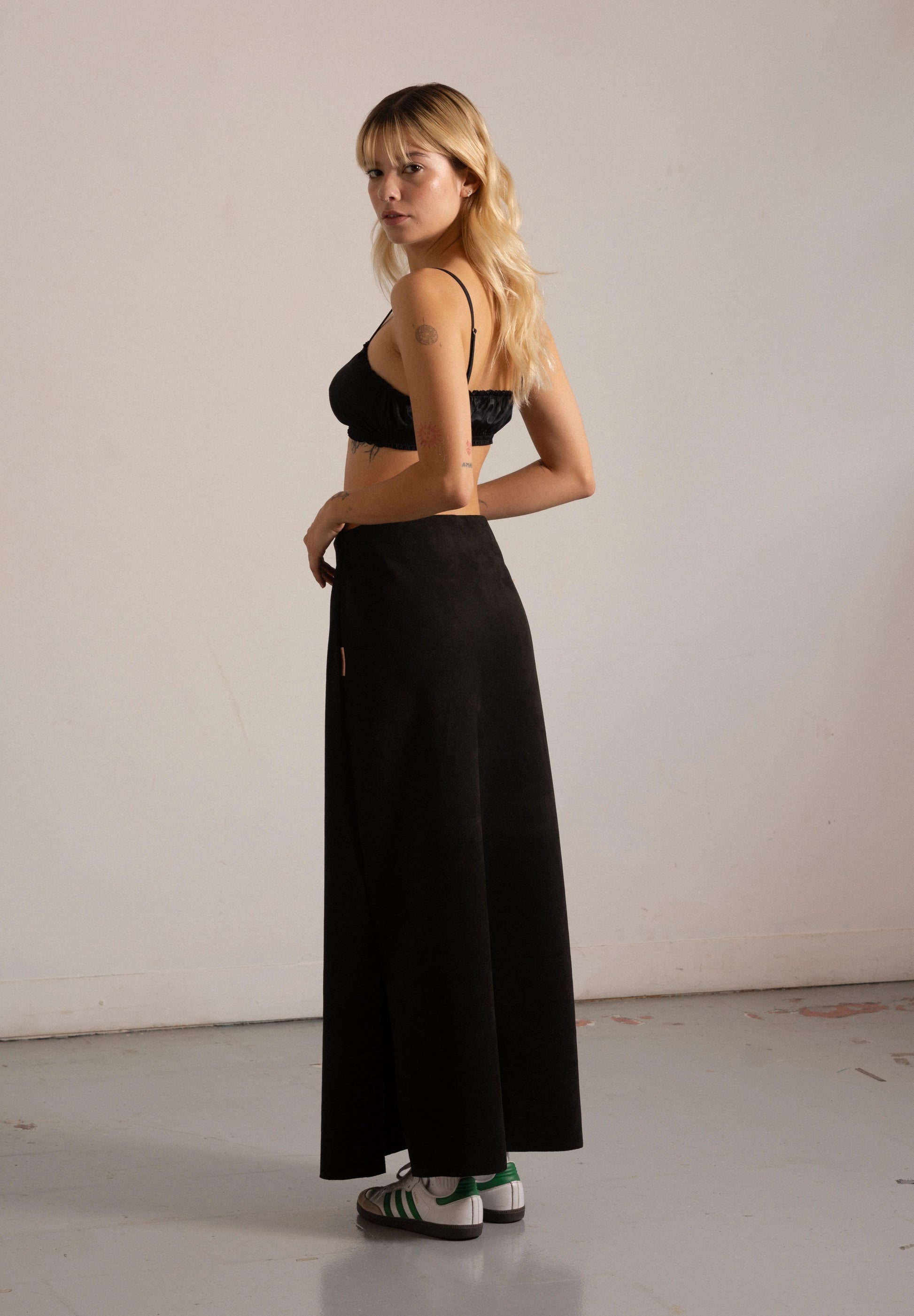 Falda larga tipo tubo en tela tipo suede, suave al tacto y de apariencia lujosa.