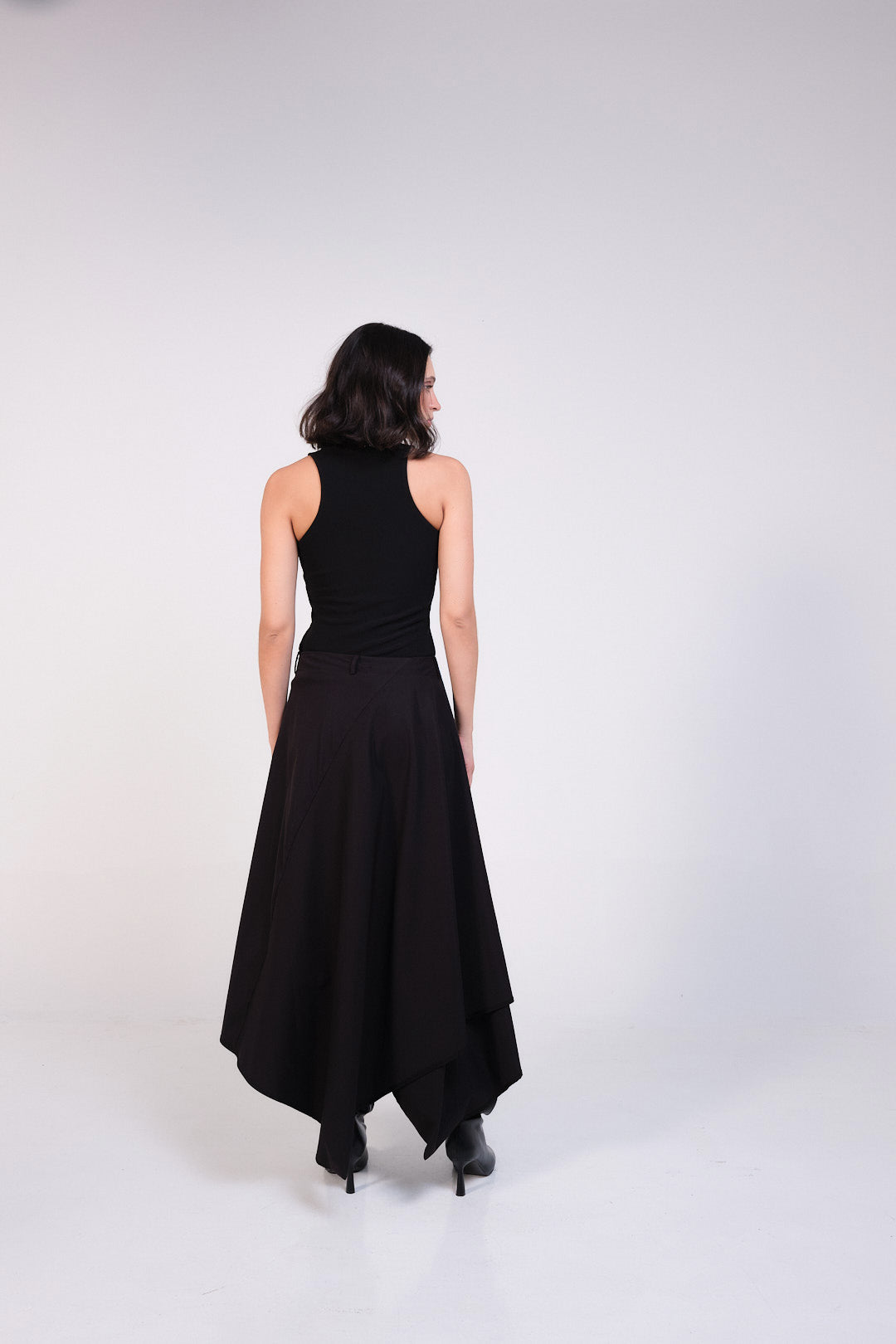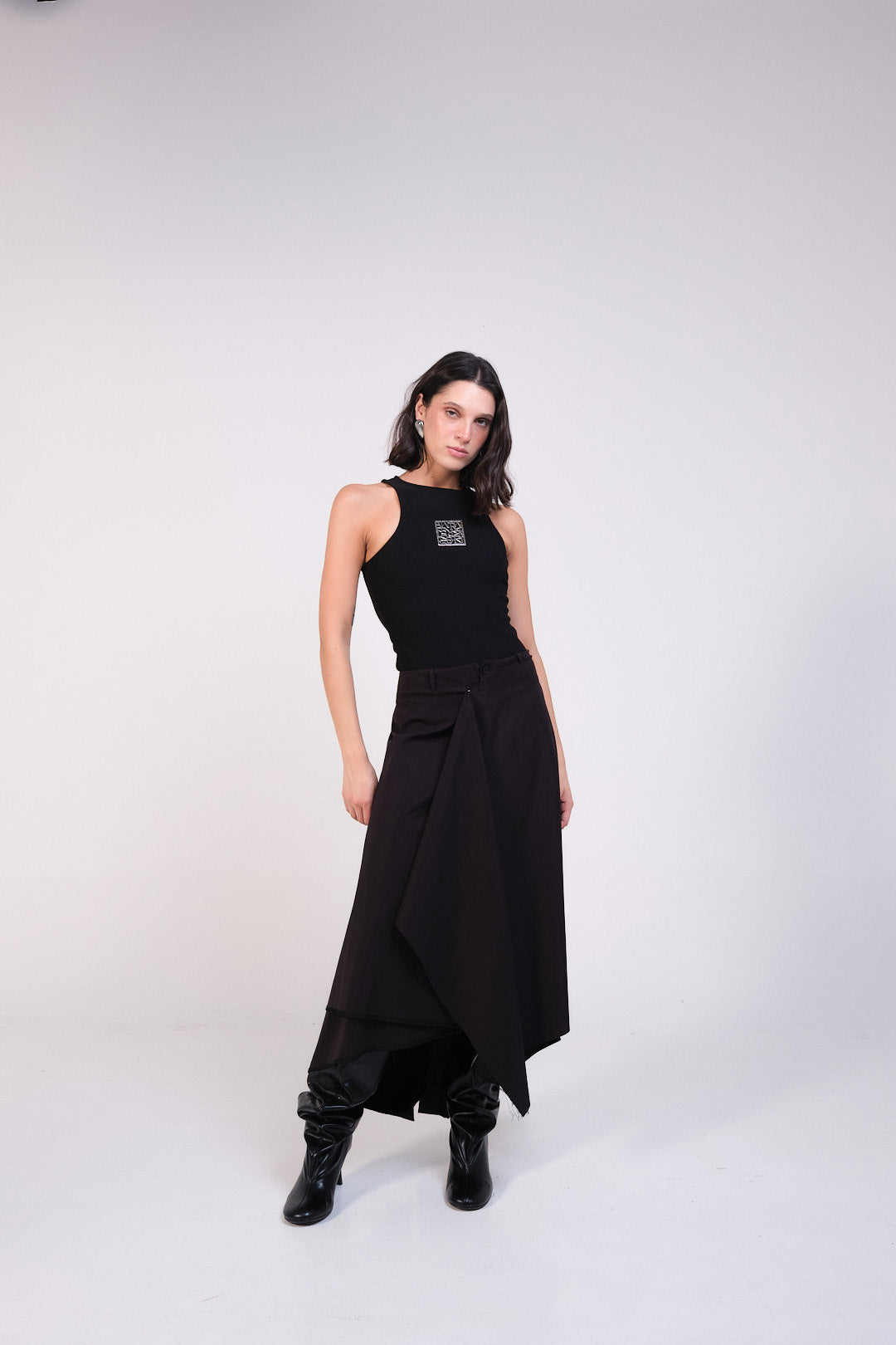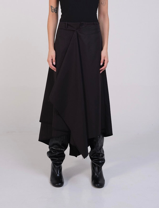 Falda en dril negro con capas asimétricas, con botón y pasadores.