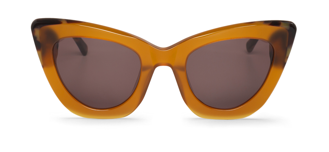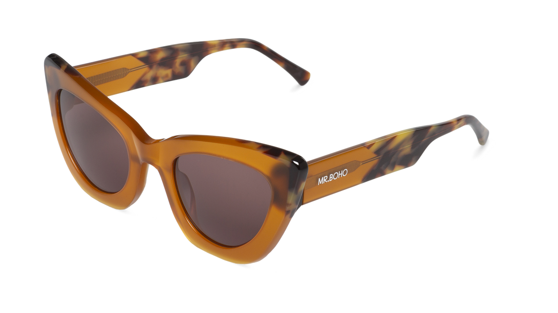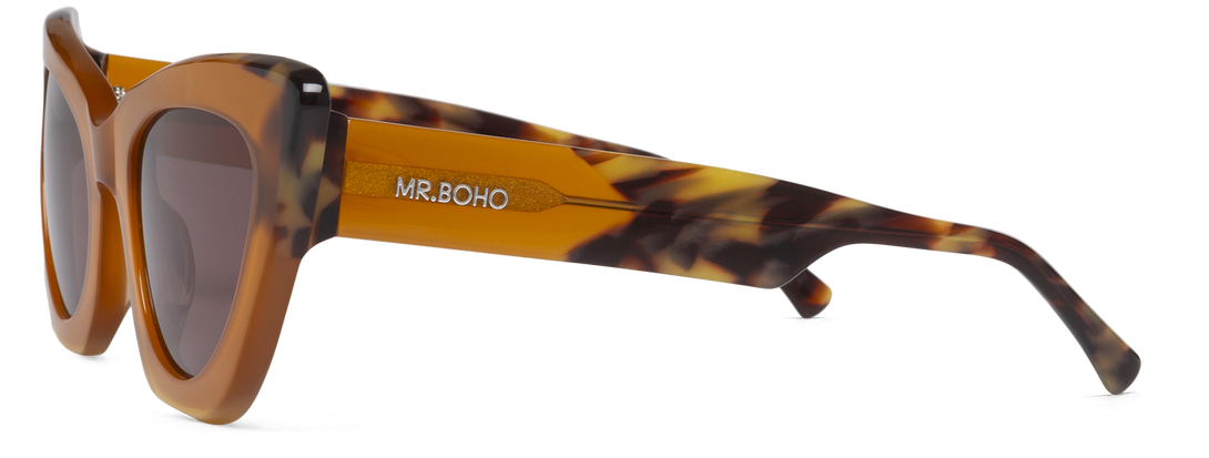 diseño estilo cat-eye con una montura de color ámbar translúcido y detalles carey en las esquinas. ideal para un look sofisticado y moderno.