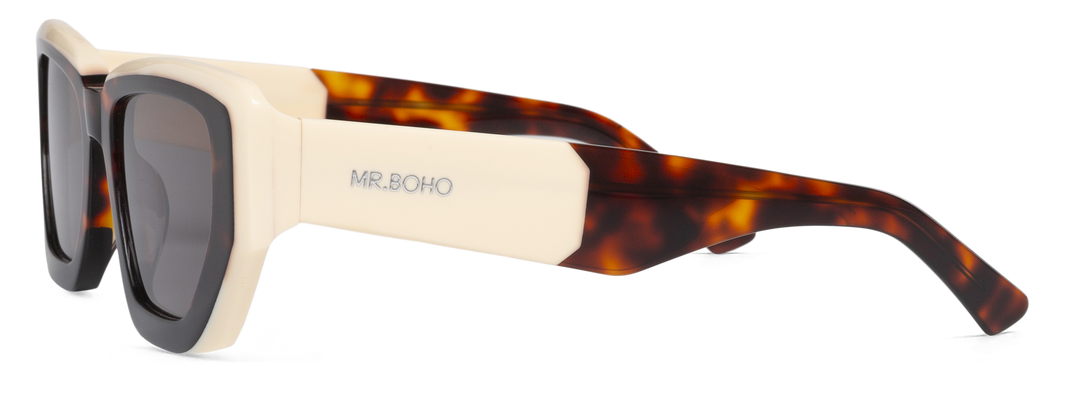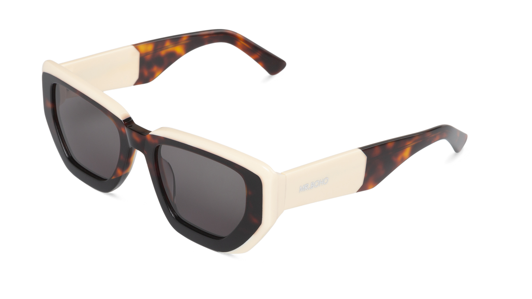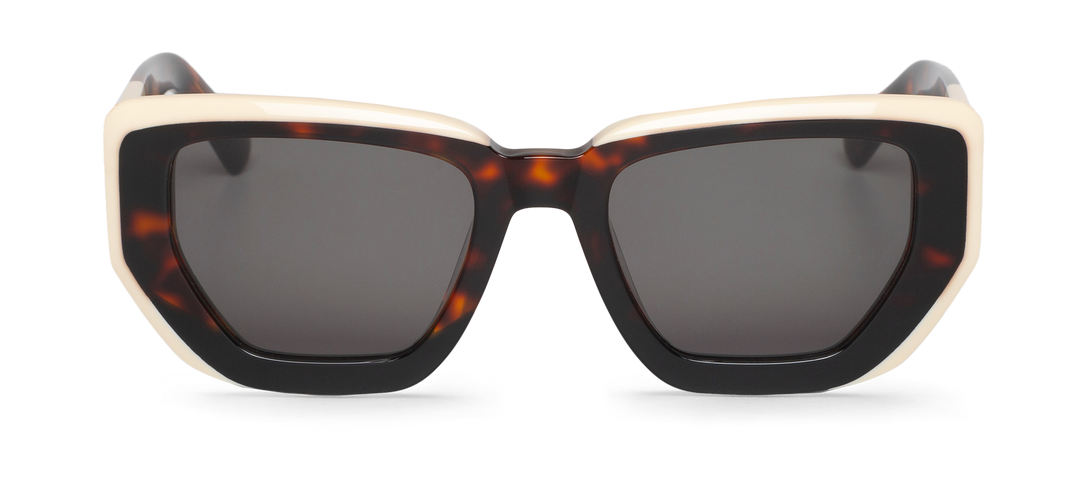 Gafas de sol con un armazón geométrico en tonos carey oscuro y marfil. Su contraste de colores y líneas angulares ofrece un estilo vanguardista con un toque elegante y moderno.
