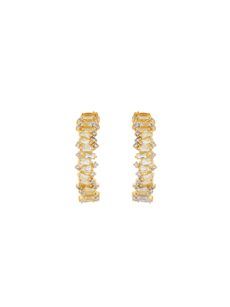 Aretes en plata ley 900 y bronce con baño de oro de 24 kilates e incrustación de cristales baguettes color cristal translúcida.