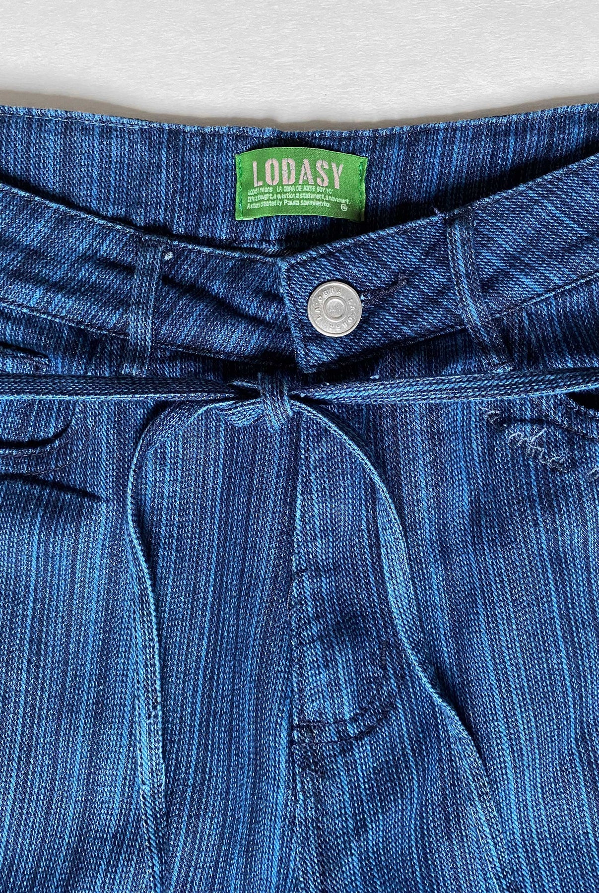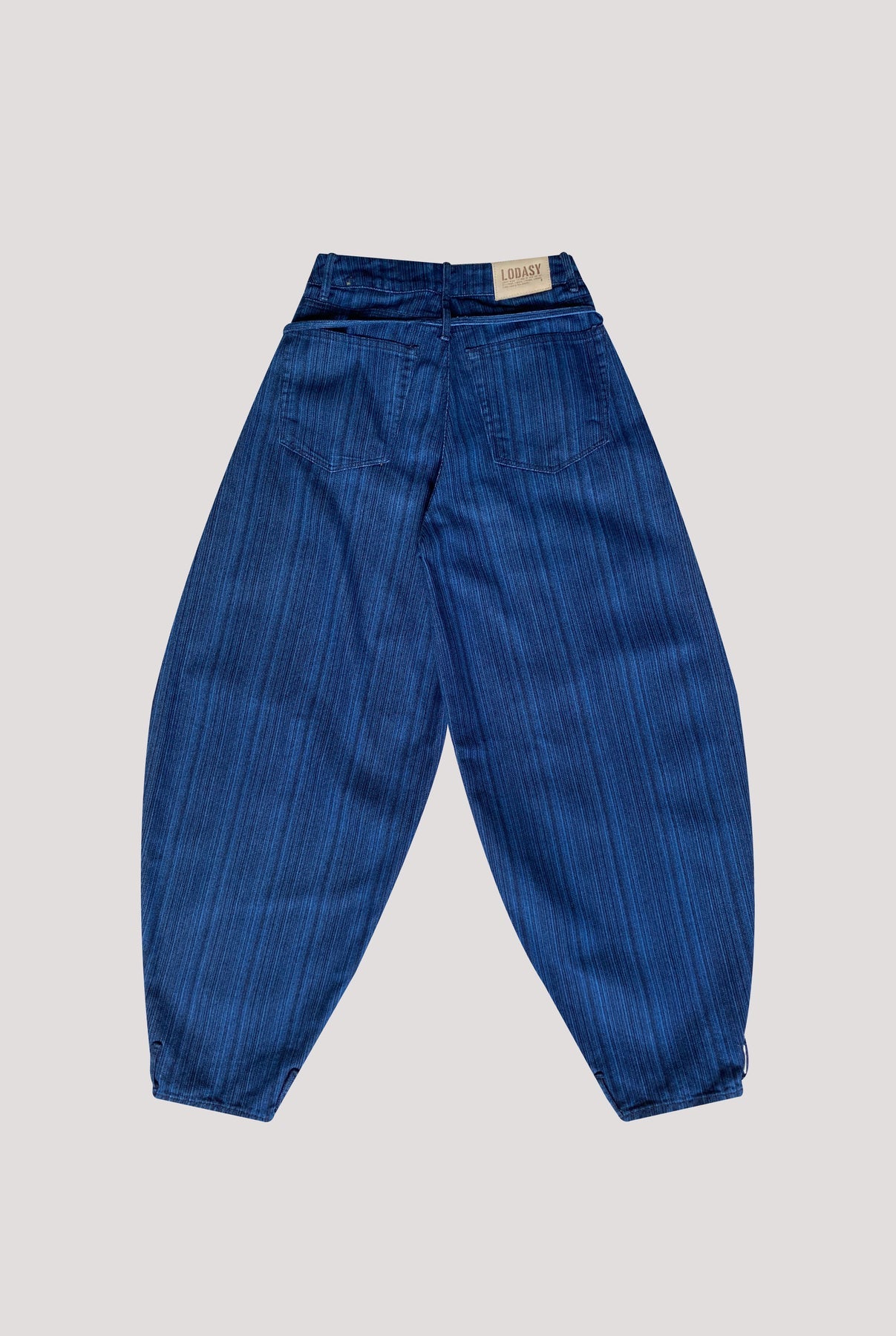 Jean silueta balloon, hecho en denim 100% algodón a rayas con cinturón de adorno