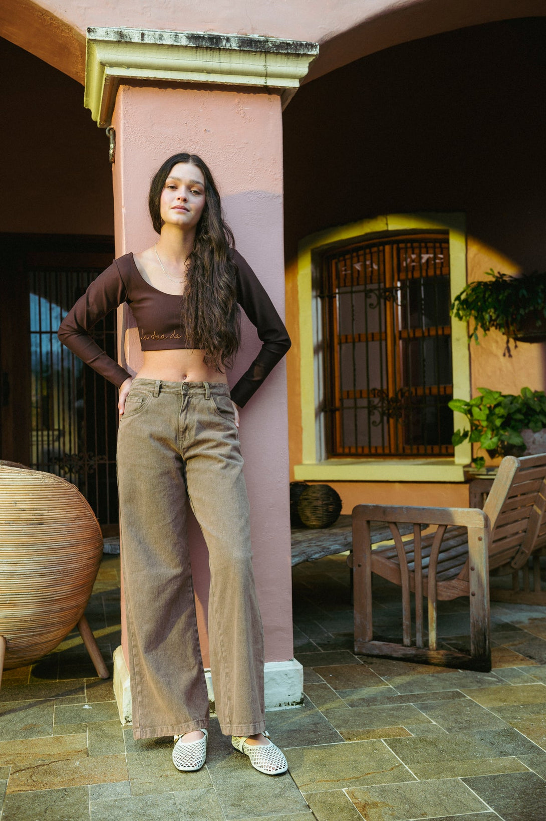 Jean acampanado color café hecho en tela índigo 100% algodón.
