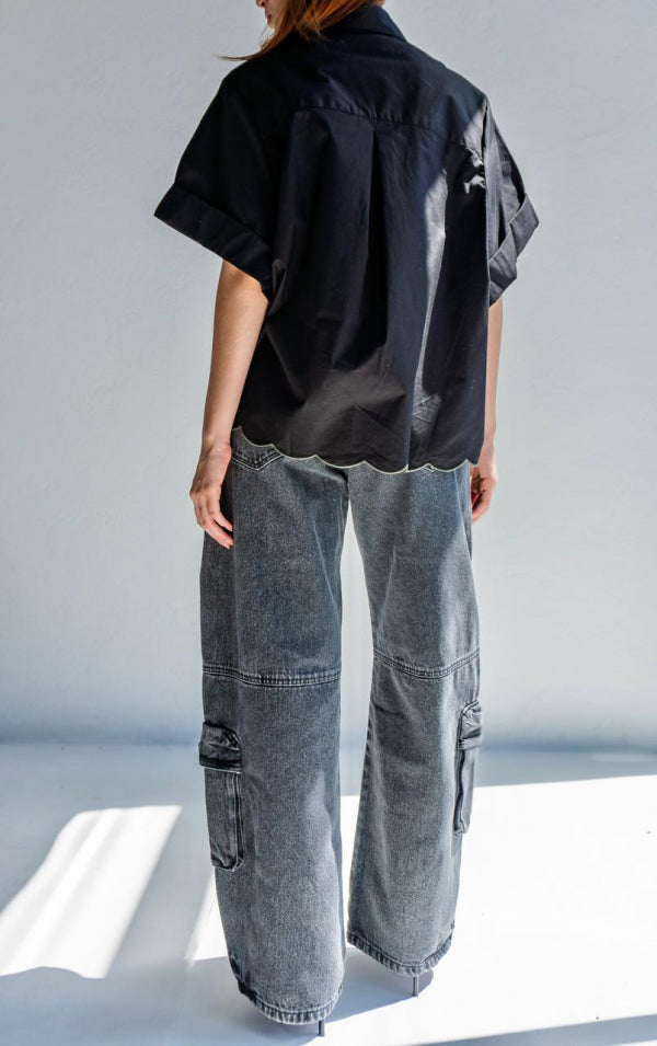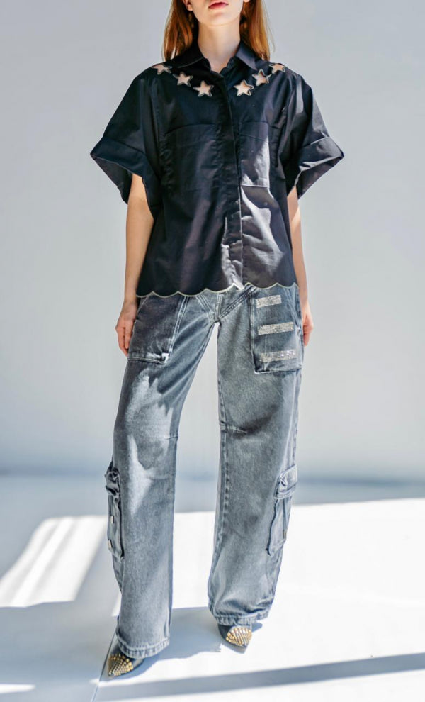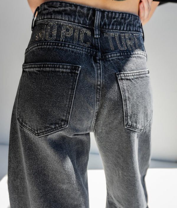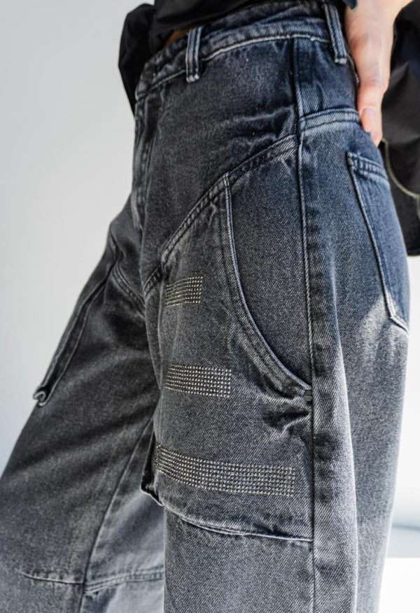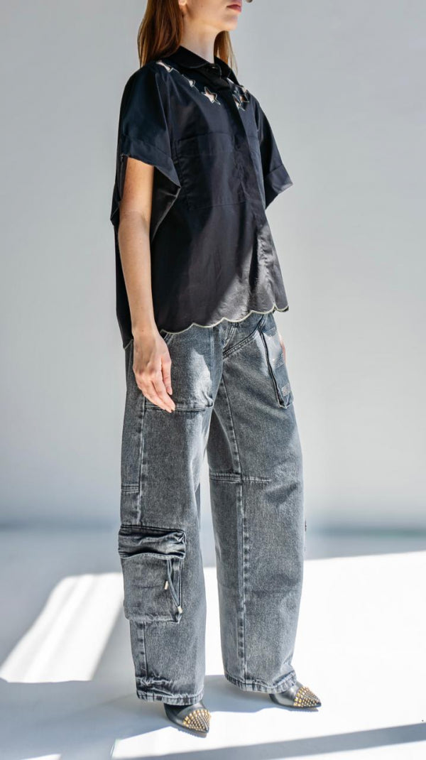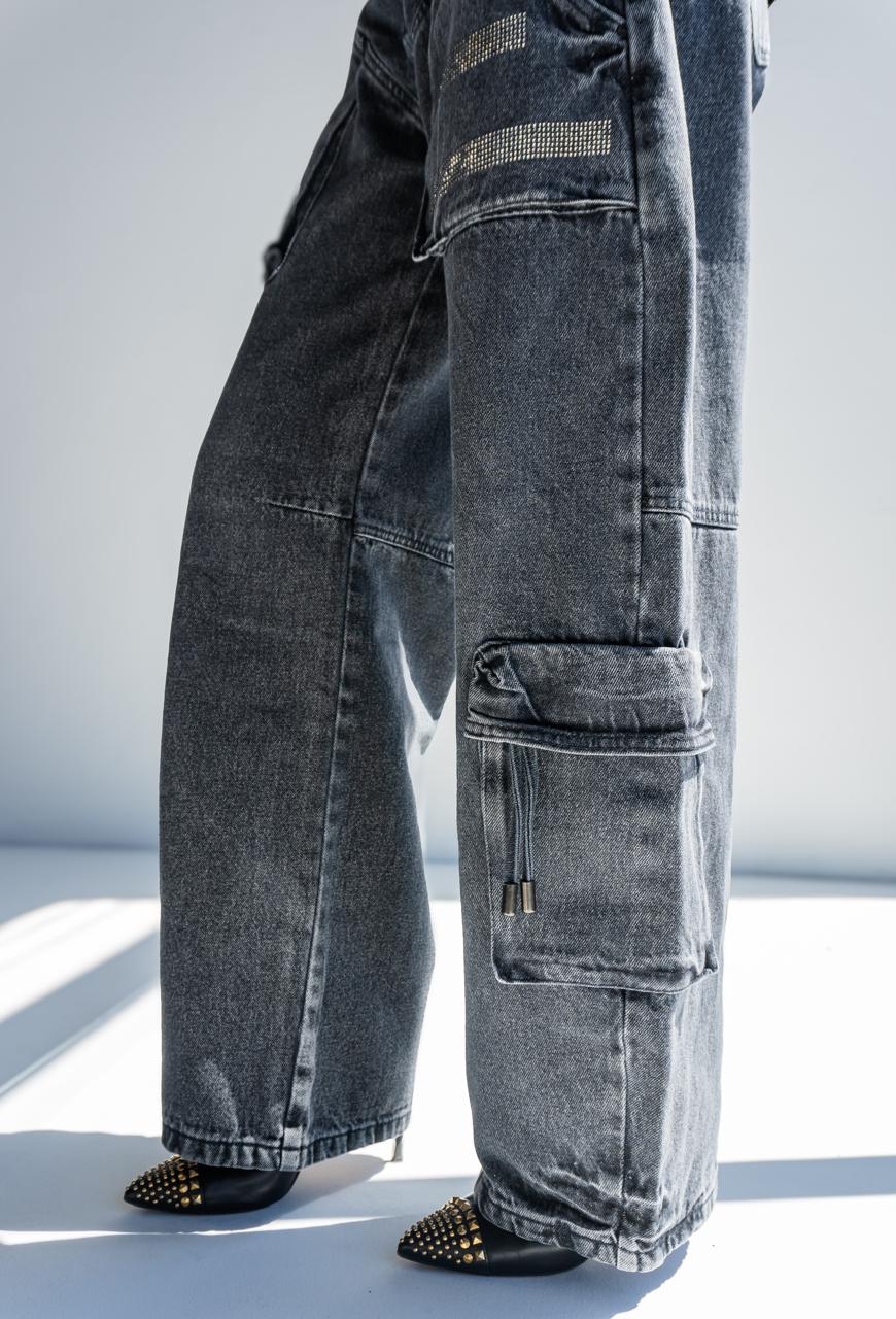 Jean Cargo talle alto, con multiples bolsillos y cortes de diseño. Adicionalmente cuenta con apliques statement de piedras en el posterior con la frase en inglés “NO PICTURES” y aplique de franjas decorativas en el delantero