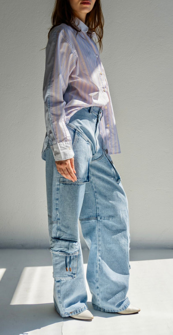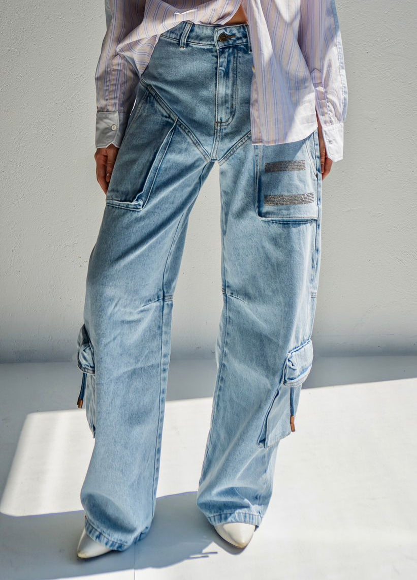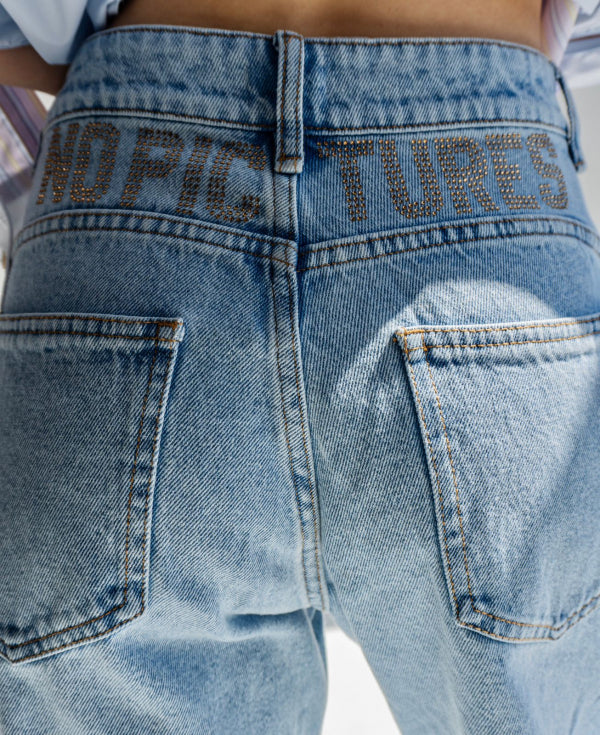 Jean Cargo talle alto, con multiples bolsillos y cortes de diseño. Adicionalmente cuenta con apliques statement de piedras en el posterior con la frase en inglés “NO PICTURES” y aplique de franjas decorativas en el delantero