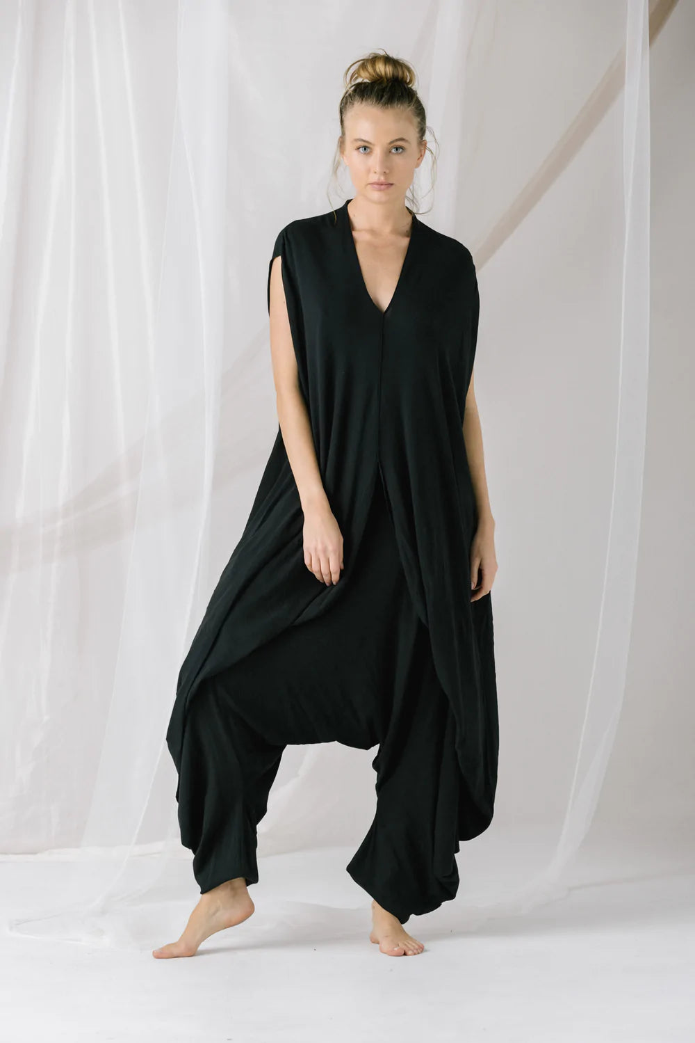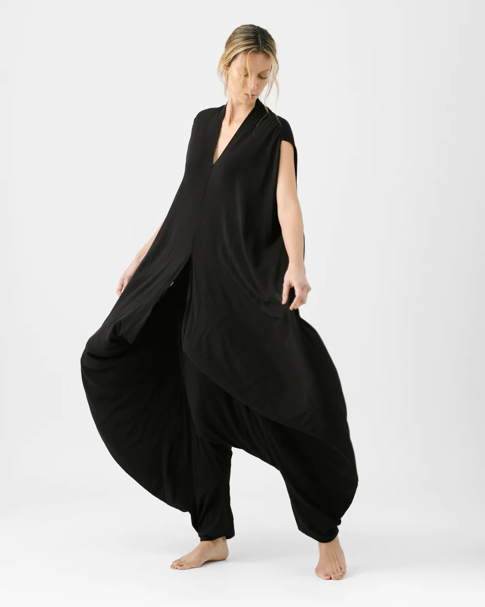Jumpsuit color negro, son dos piezas en uno (inferior + superior). Escote en pico y manga sisa en hombros. Tiro bajo. Bolsillos delanteros. Bota con terminación en elástico. Puedes usarlo suelto, anudado, con un cinturón. Hecho en Colombia.